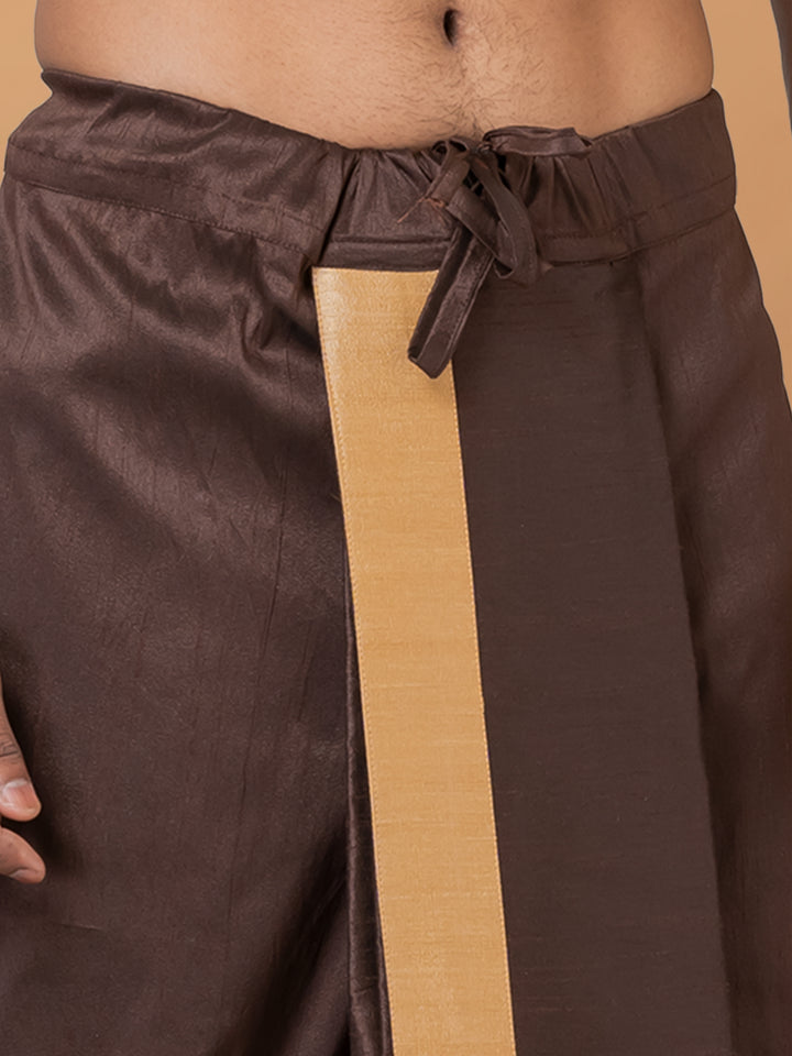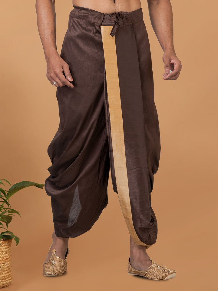 Infuse your festive wardrobe with earthy elegance in this Coffee Brown Dhoti, beautifully highlighted by a contrasting beige border. Designed for the modern man with a love for tradition, this dhoti features a soft silk-blend fabric that drapes gracefully and ensures all-day comfort.