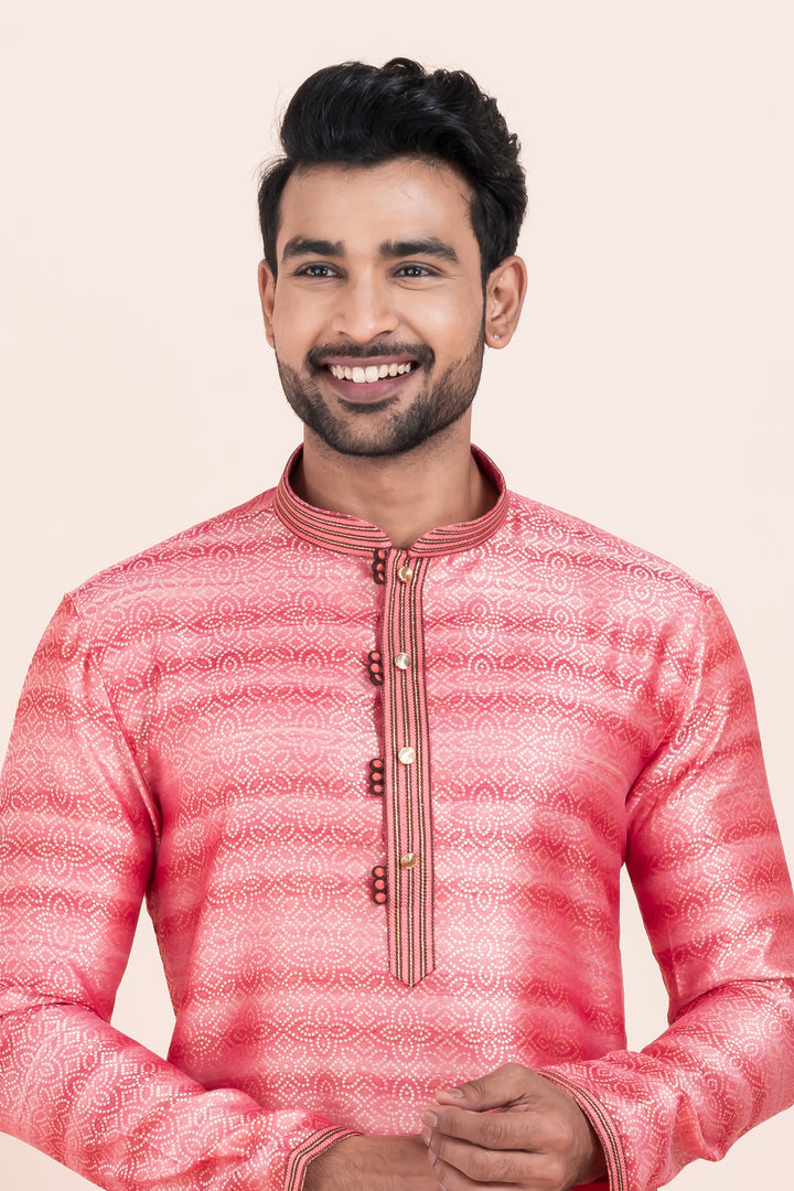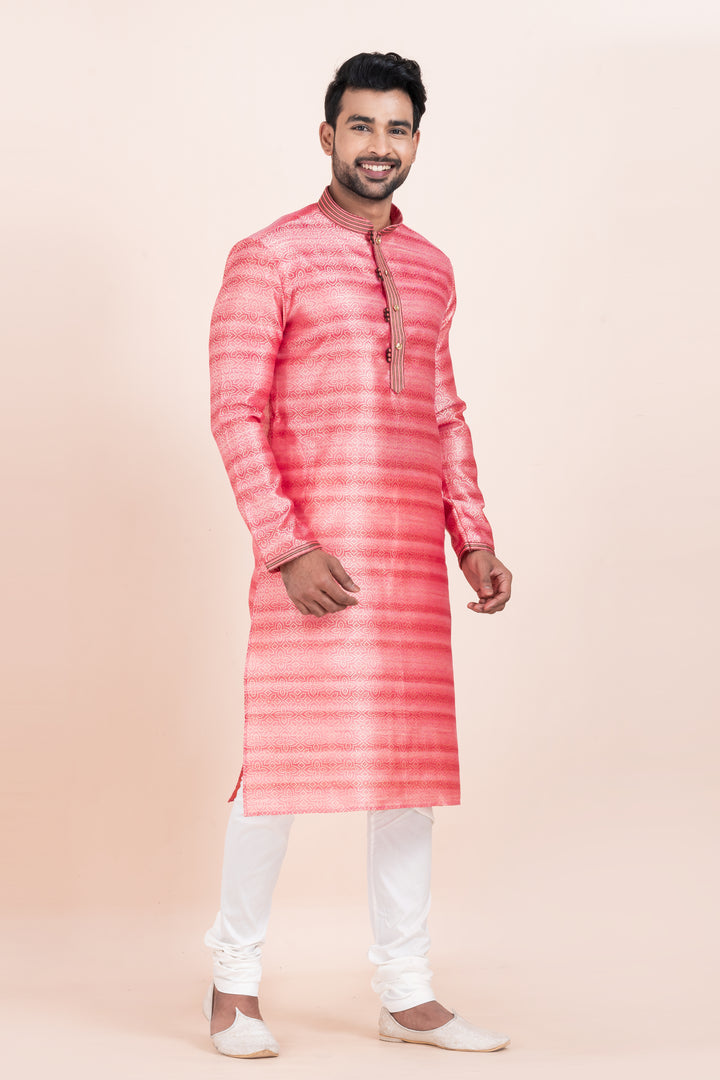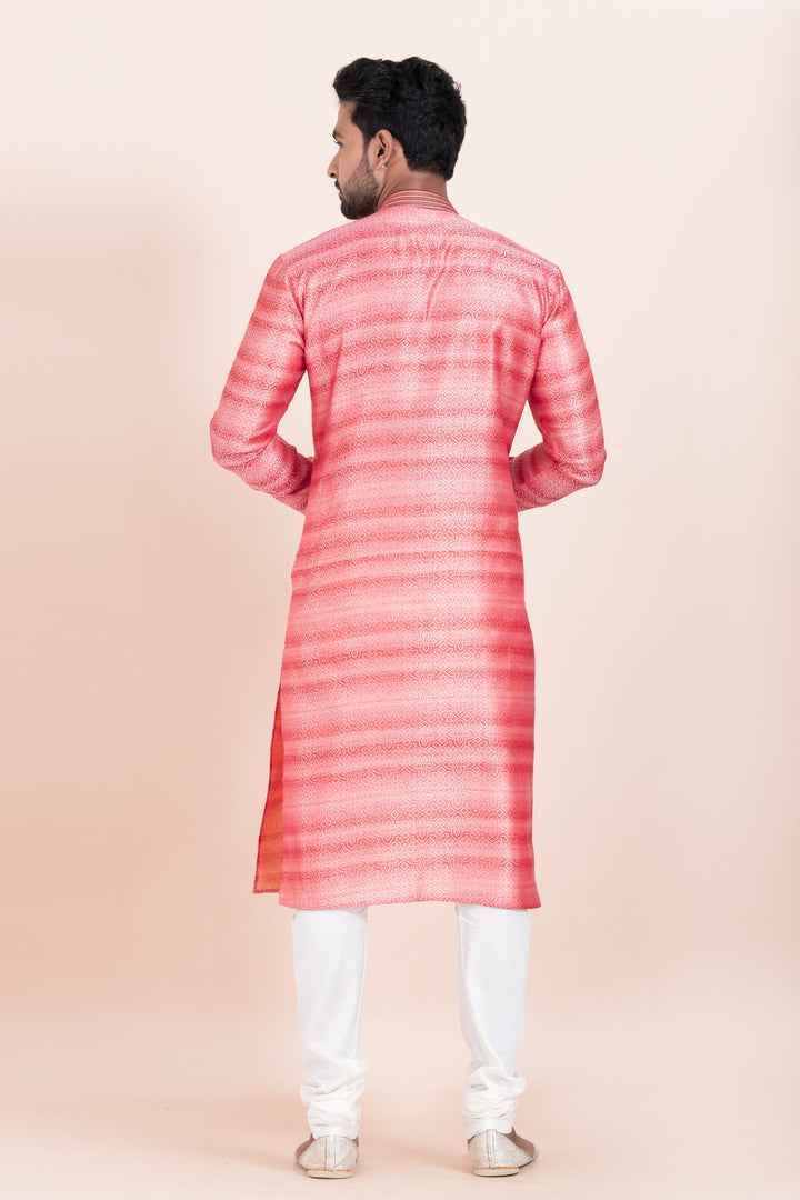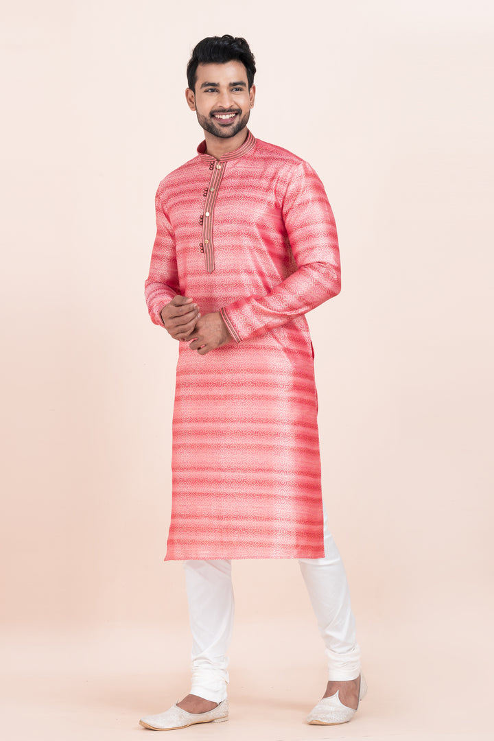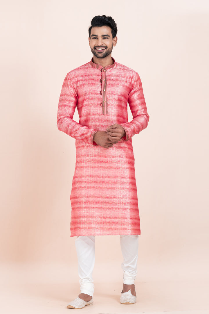 Make a vibrant entrance with this Coral Shine Kurta Set – crafted in rich brocade silk for the man who’s made for the spotlight.