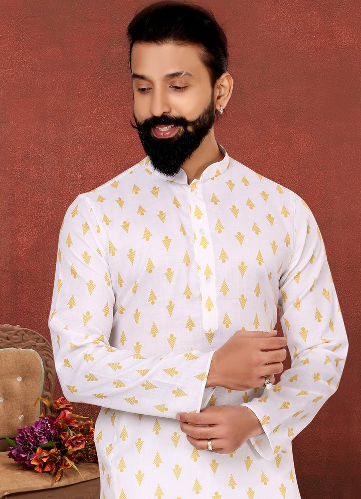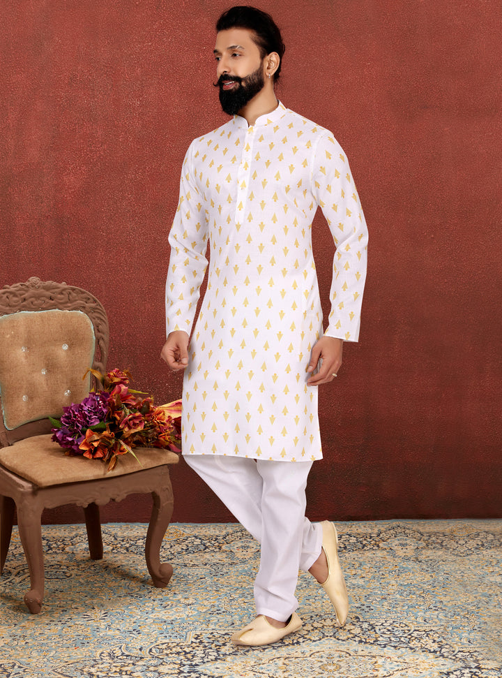 Elevate your ethnic charm with this graceful white kurta adorned with golden digital motifs, exuding a subtle yet regal vibe. Crafted from soft breathable cotton, the kurta promises all-day comfort with a touch of sophistication. Paired with a crisp white Dupion silk pyjama, this ensemble is perfect for both traditional and festive occasions.