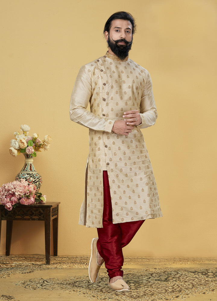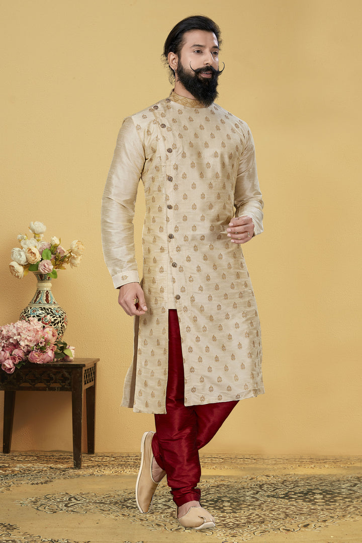 Command attention in this cream asymmetric embroidered kurta paired with a bold maroon pyjama — a modern twist on regal tradition. The kurta is tailored from high-quality art silk and adorned with all-over zari buti work in gold. Designed with an eye-catching asymmetric button placket and royal bandhgala neckline, this piece is finished with textured buttons that elevate its luxurious appeal. The contrasting maroon churidar adds a festive flair to complete this striking ensemble.