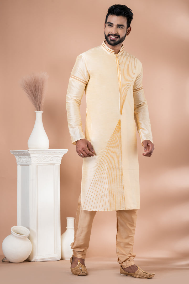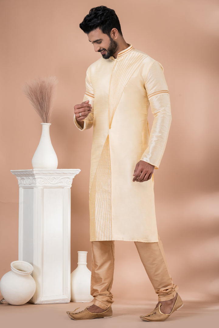 Add a modern royal charm to your festive wardrobe with the Angasudha Cream Dupion Silk Kurta Set. This stylish ensemble features a luxurious Dupion silk kurta in a soothing cream hue, adorned with clean, geometric linear embroidery in a radiant gold tone, extending from the shoulder to the hem in an eye-catching asymmetrical design.