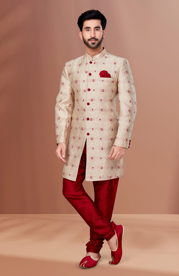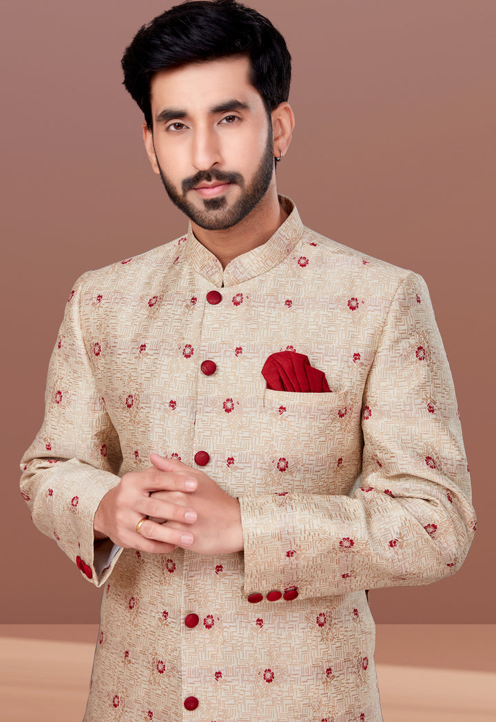 Grace meets grandeur in this refined Indo-Western set from Angasudha, tailored for the modern groom and wedding guests alike. The cream-colored jacket is intricately woven with subtle geometric texture and embroidered with maroon floral motifs, enhanced by bold matching buttons and a statement pocket square.