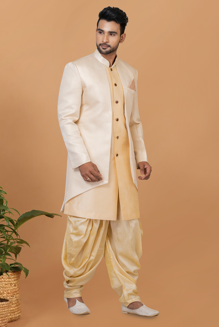 🔸 Inner Kurta & Dhoti: Banarasi Dhupion Silk in golden beige for a lustrous and regal look