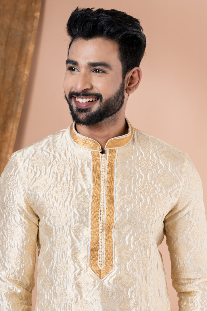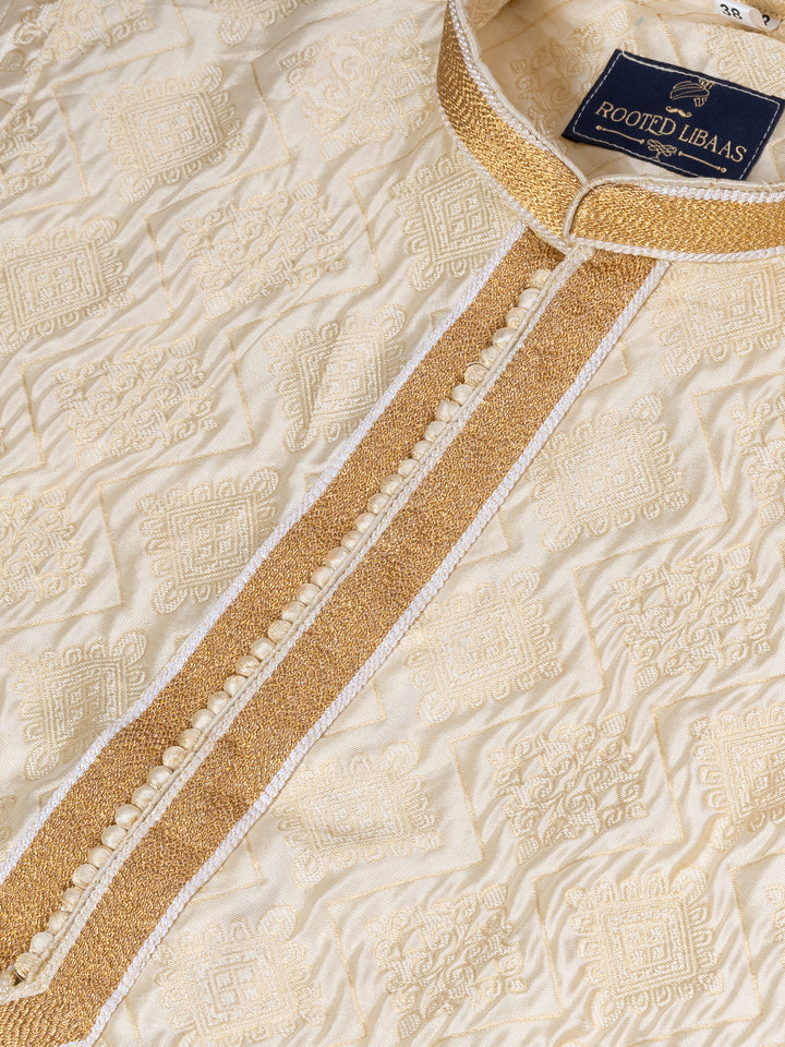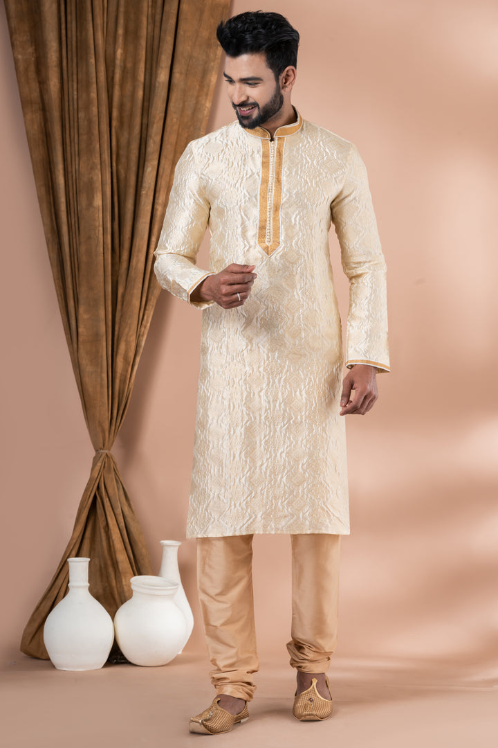 Embrace a look of refined simplicity with this Cream Textured Jacquard Kurta Set, tailored for men who appreciate classic elegance. The kurta features an intricate self-patterned jacquard weave, enriched with subtle sheen and detailed embroidery on the placket and collar, offering a regal yet understated aesthetic.