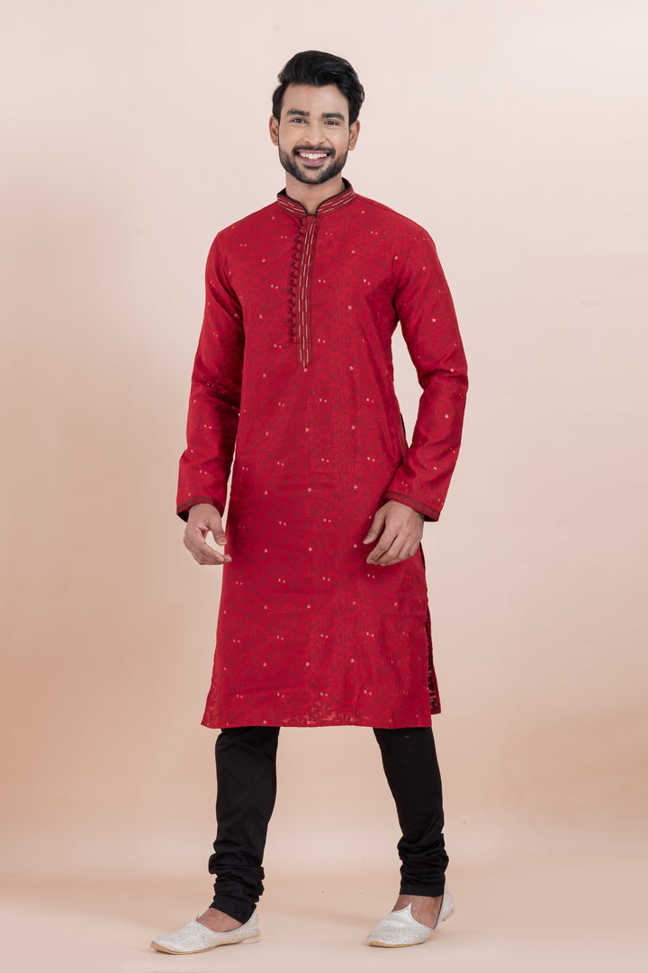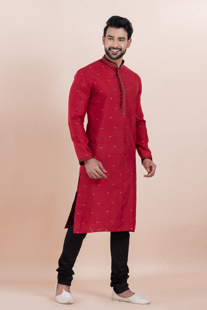Unleash your festive spirit with this bold and beautiful crimson red embroidered kurta pyjama set. Crafted in textured jacquard with subtle all-over embroidery, this kurta radiates elegance with its detailed button placket, mandarin collar, and sleek silhouette. Paired with a contrasting black churidar, the outfit adds a sharp modern edge to its traditional base, making it a stylish choice for evening functions and celebrations.