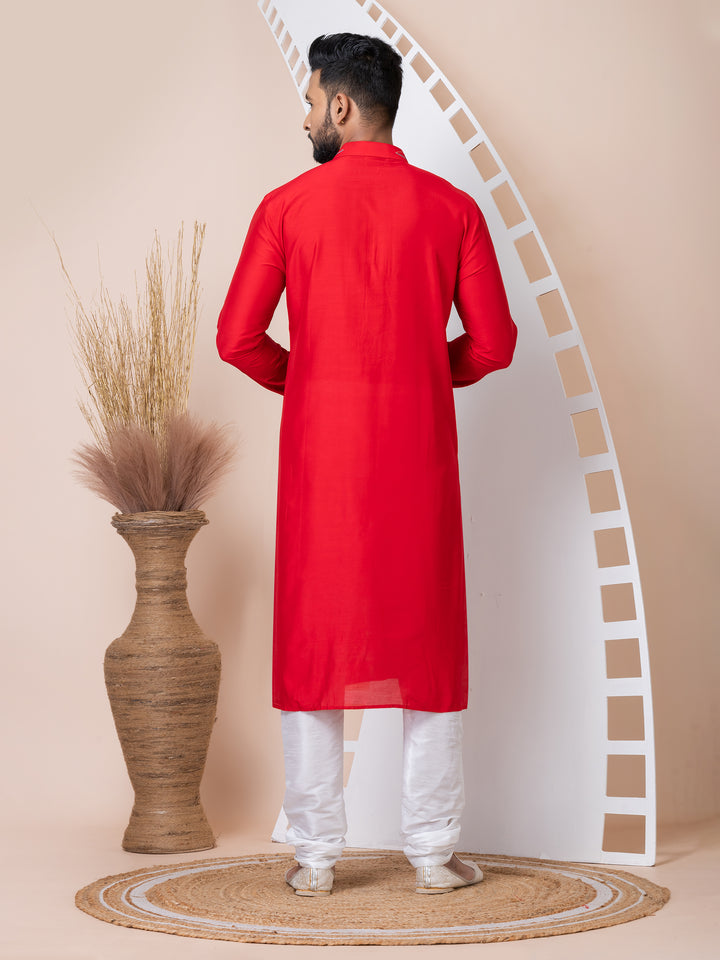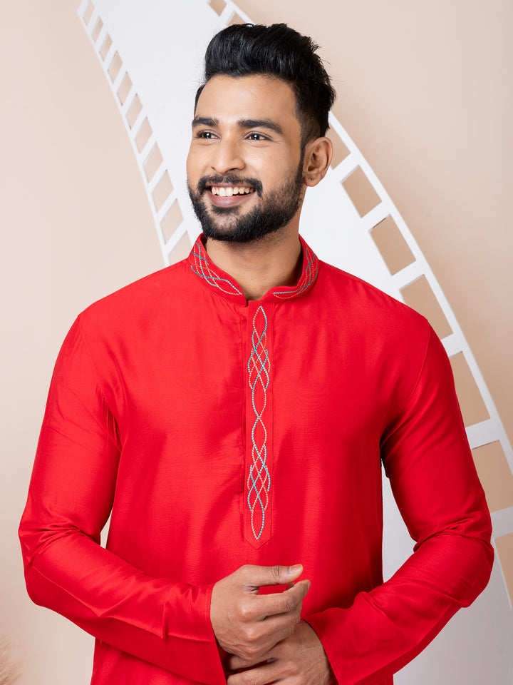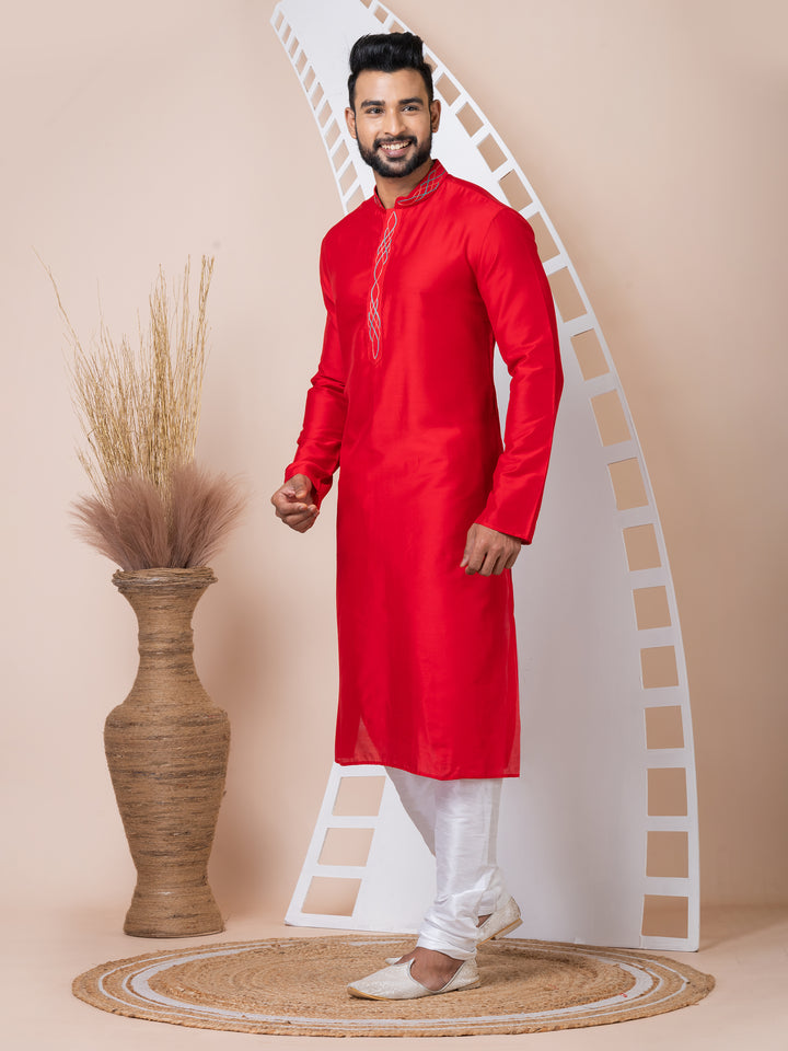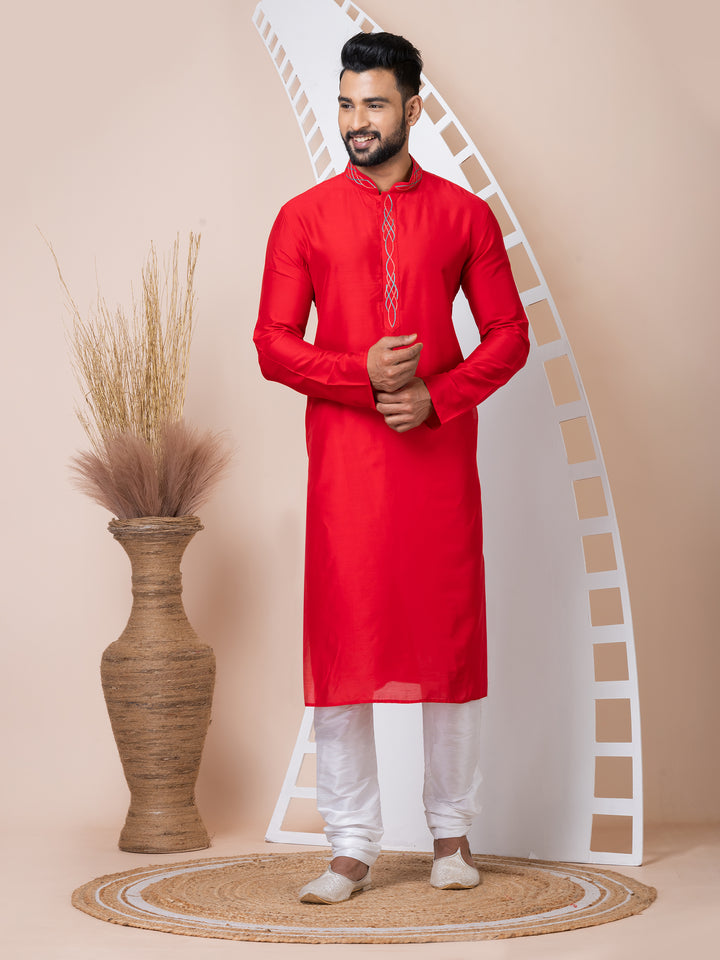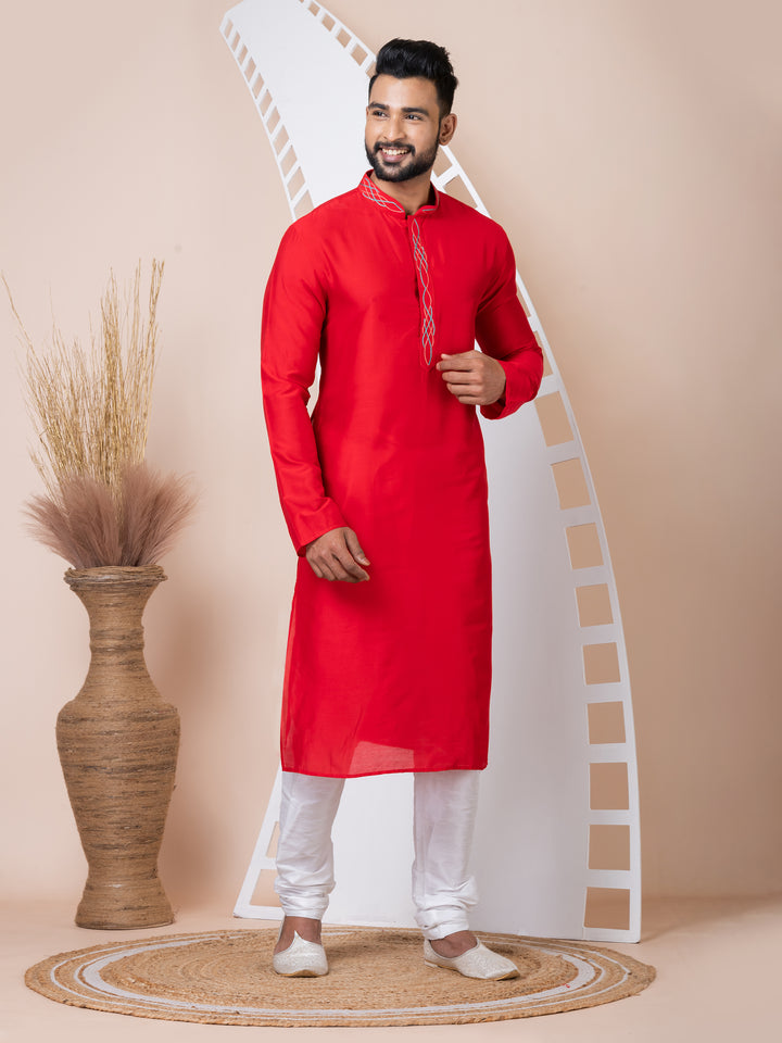 Make a bold and elegant statement with this Crimson Charm kurta pyjama set. Crafted from lustrous silk-blend fabric, the vibrant red kurta features multicolor thread embroidery on the placket and mandarin collar, offering a subtle touch of artistry. The clean silhouette and minimalistic design keep it versatile and classy. Paired with a crisp white churidar, this ensemble is perfect for festive moments and traditional celebrations.