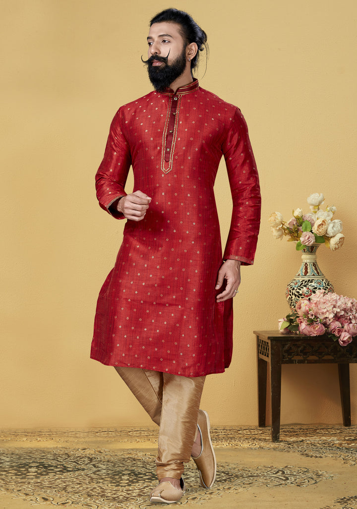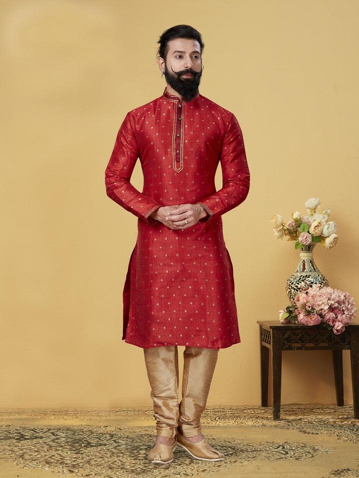 Turn heads with timeless elegance in this crimson red kurta pyjama set, meticulously crafted from woven art silk. Adorned with subtle gold motifs throughout, the kurta is accentuated by a sleek mandarin collar and a refined front placket with piping and button detailing. The ensemble is completed with a beige-gold churidar pyjama, creating a perfect balance of vibrancy and grace.