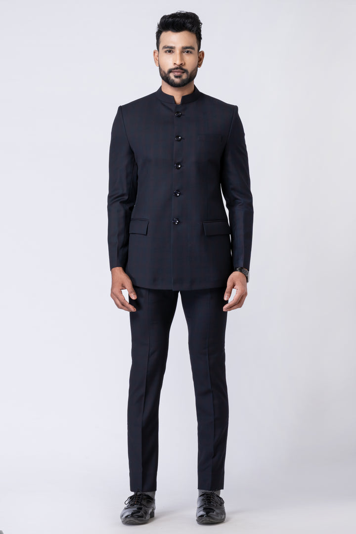 Step into understated luxury with this Deep Charcoal Checkered Jodhpuri Suit, crafted for the man who prefers subtle elegance over loud statements. Featuring a classic bandhgala collar and finely detailed check pattern, this suit offers timeless appeal with a modern silhouette.