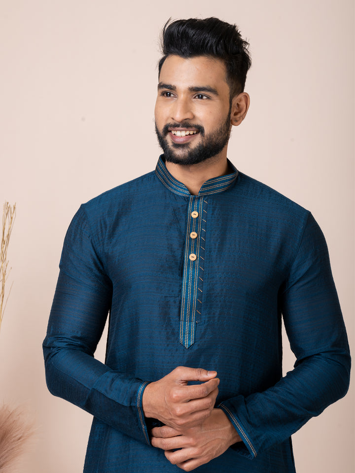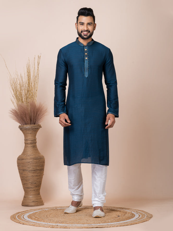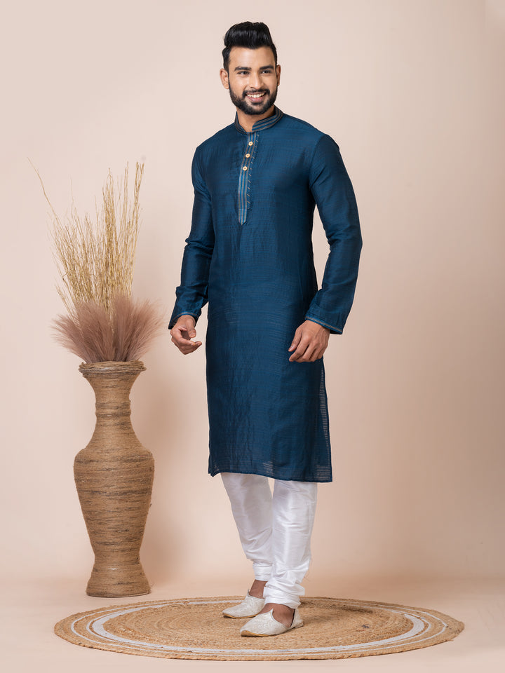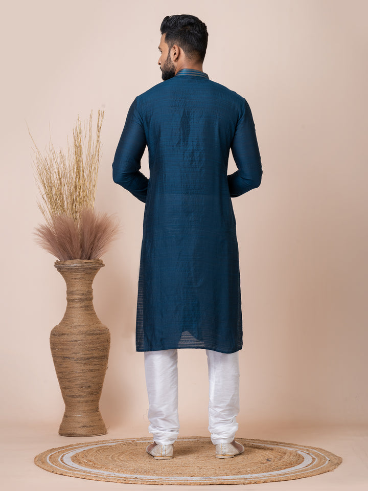 Exude classic charm with this Deep Teal Textured Kurta set, a timeless piece crafted for sophistication and style. The kurta features a subtle vertical self-texture that adds depth to the rich teal hue, while the wooden button placket and piping details on the collar and cuffs offer a tasteful contrast.