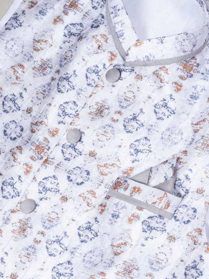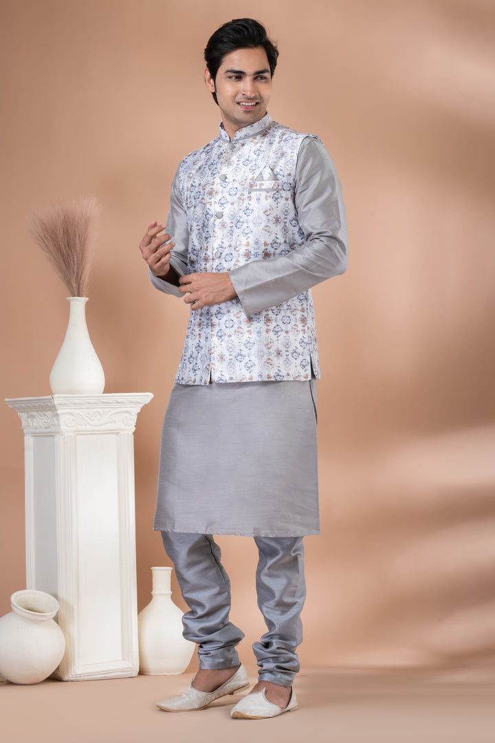 Angasudha Elegant Grey Banarasi Silk Kurta Pyjama with Printed Silk Nehru Jacket