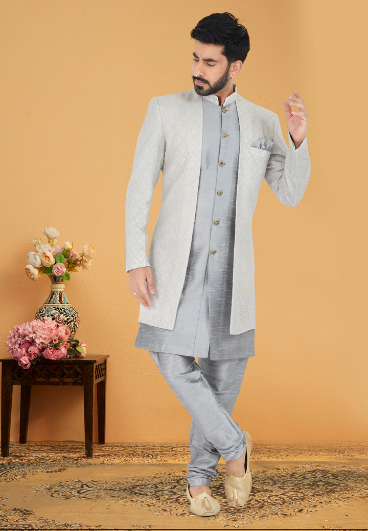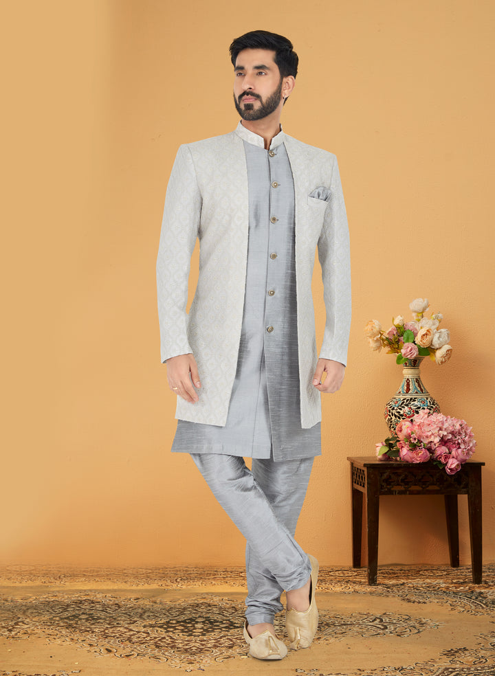 Angasudha Elegant Ivory & Silver Indo-Western Set for Men