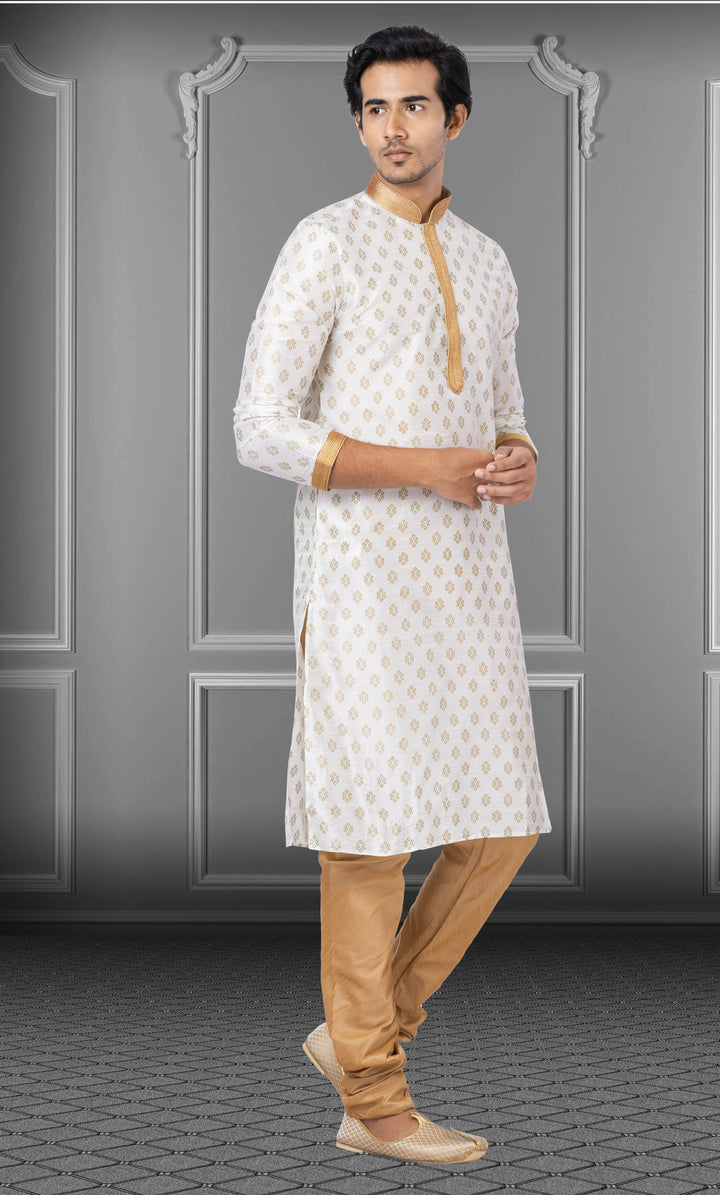 Drape yourself in subtle sophistication with this off-white Dupion kurta, delicately printed with golden geometric motifs that evoke timeless elegance. The soft sheen of Dupion fabric paired with golden detailing on the collar, front placket, and cuffs makes it a graceful pick for daytime festivities and religious events.