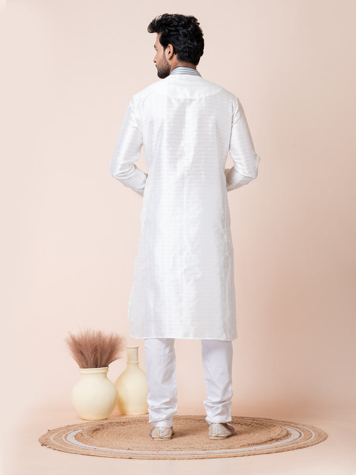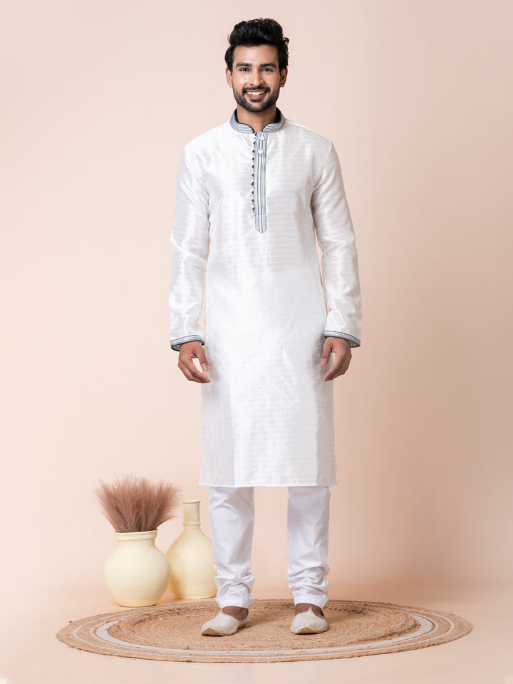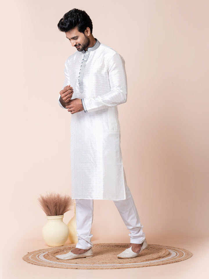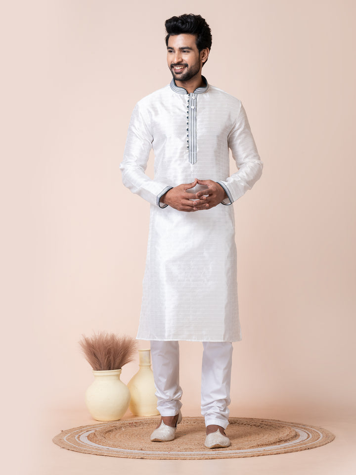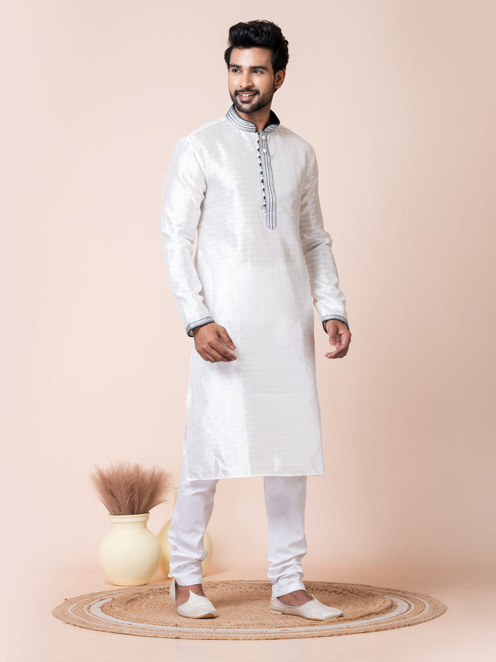 Step into timeless elegance with this classic white silk kurta pajama set, perfect for festive occasions, weddings, or traditional celebrations. Crafted from premium quality silk-blend fabric, the kurta features a subtle self-textured pattern that adds a touch of sophistication. The design includes a mandarin collar with intricate contrast piping and a button-down placket, enhancing its regal appeal. Complemented with matching white churidar-style pajama pants, this ensemble strikes the perfect balance between tradition and style. Pair it with mojaris or embroidered juttis for a complete ethnic look.