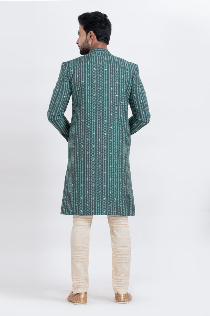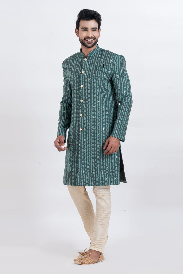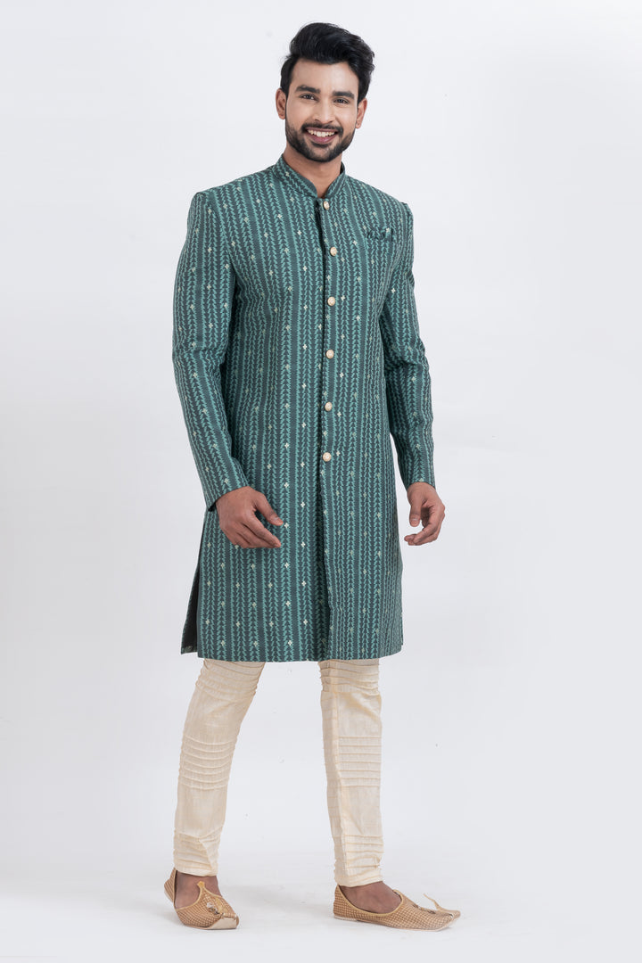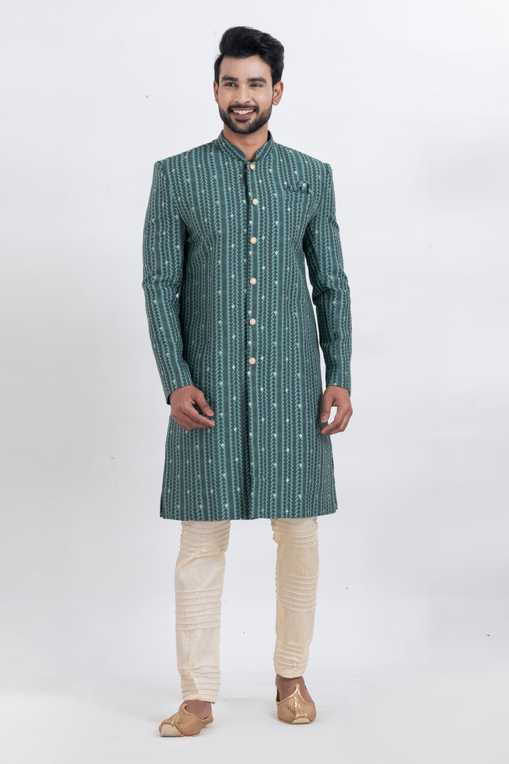 Make a statement in the refined charm of our Emerald Majesty Indo Western Set. Crafted in a rich green fabric with vertical woven patterns and subtle sequin detailing, this outfit captures the essence of modern tradition. The contrasting cream churidar adds balance, while the mandarin collar and golden buttons infuse a regal touch perfect for celebrations and ceremonies.