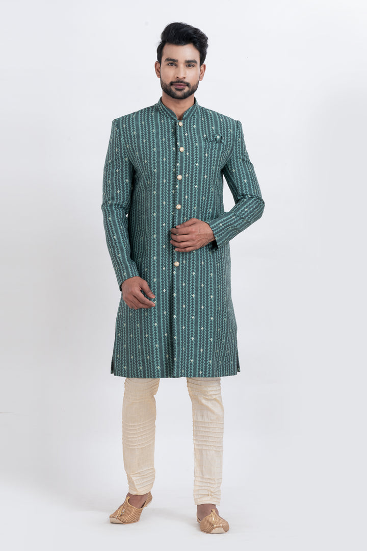 Design Highlights: Vertical Pattern Weave, Bandhgala Collar, Golden Button Closure, Pocket Square Accent