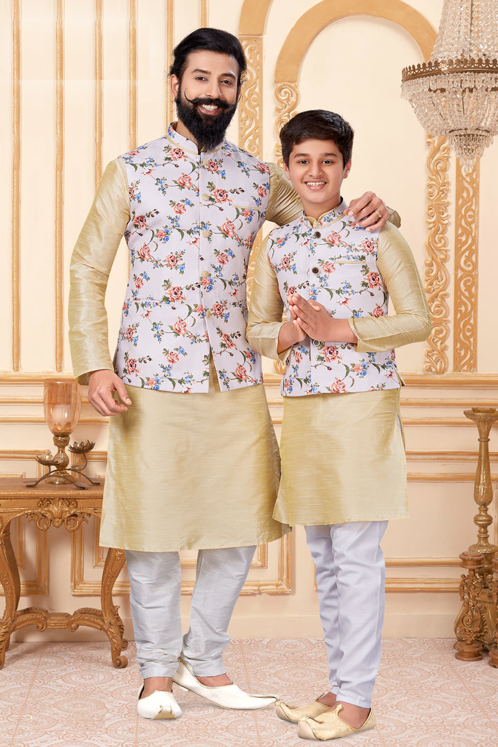 Set includes: 1 Beige Kurta, 1 Pajama & 1 White Floral Nehru Jacket (for both father and son)