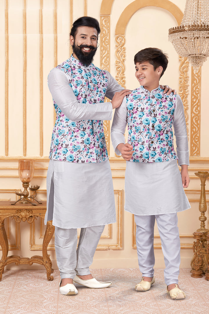 Set includes: 1 Light Grey Kurta, 1 Pajama & 1 Multicolor Floral Nehru Jacket (for both father and son)