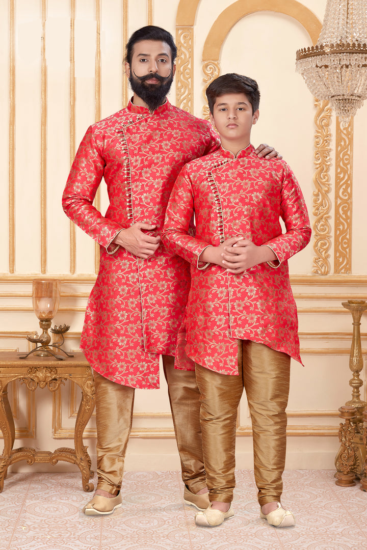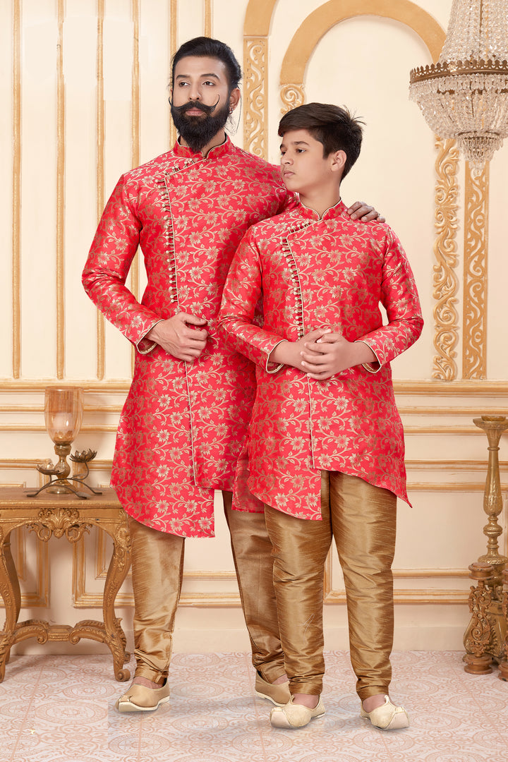 Angasudha Father-Son Matching Red Brocade Indo-Western Set