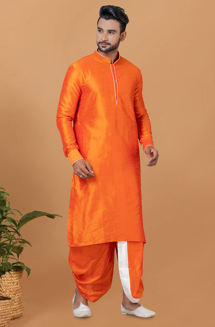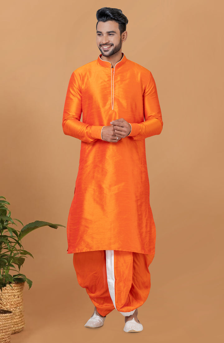 Ignite your festive style with our Festive Flame Dhoti Kurta Set, a bold and vibrant ensemble that celebrates tradition with a modern flair. The kurta, in a fiery orange hue, is made from a lustrous silk blend fabric and enhanced with a sleek mandarin collar and white piping along the neckline and cuffs, adding sharpness to its festive glow.