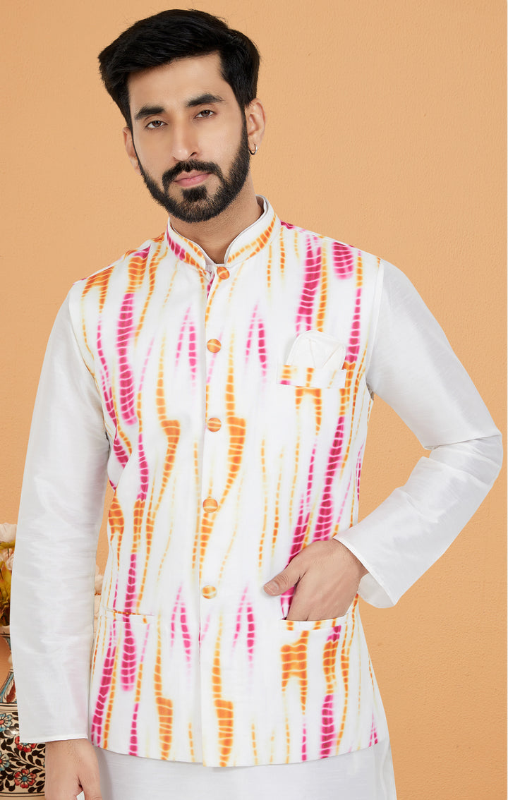 Inject joyful color into your festive wardrobe with the Angasudha Festive Vibes set. This unique outfit features a vibrant sleeveless waistcoat in a white base with cheerful tie-dye-style vertical strokes in pink, orange, and mustard. The kurta and churidar are made from pure white Dupion Silk, creating a clean canvas that lets the waistcoat pop.