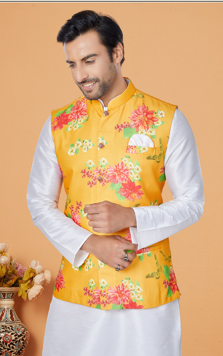 Waistcoat: Digital Printed Cotton (Yellow with Floral Design)