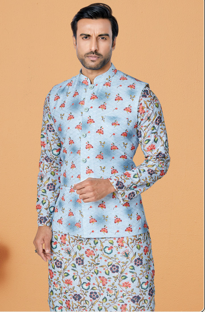 Step into floral elegance with this unique pastel blue ensemble that blends artistry with ethnic flair. The set includes a printed kurta, matching floral jacket, and classic white pyjama. The vibrant multicolor floral motifs on the jacket and kurta sleeves offer a harmonious fusion of tradition and contemporary styling.