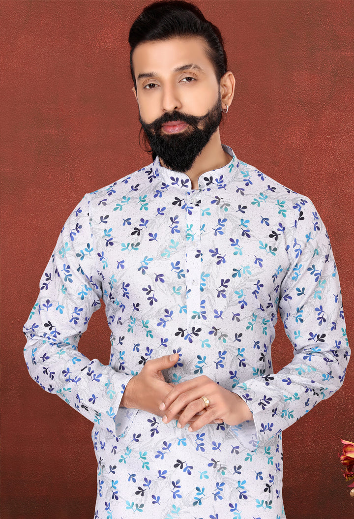 Step into serene elegance with the Frost Bloom Cotton Kurta Set, a refreshing choice for modern traditional wear. The kurta features a subtle white base adorned with delicate blue and teal floral digital prints, creating a light and airy vibe. Matched with a white Dupion Silk pyjama, this ensemble is perfect for effortless festive dressing.