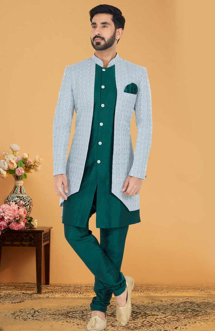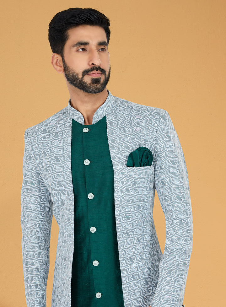 Command modern elegance with the Angasudha Frost Mint & Emerald Indo-Western Set, where structured style meets rich festive charm. This contemporary piece is designed for the gentleman who embraces bold contrasts and sleek silhouettes.