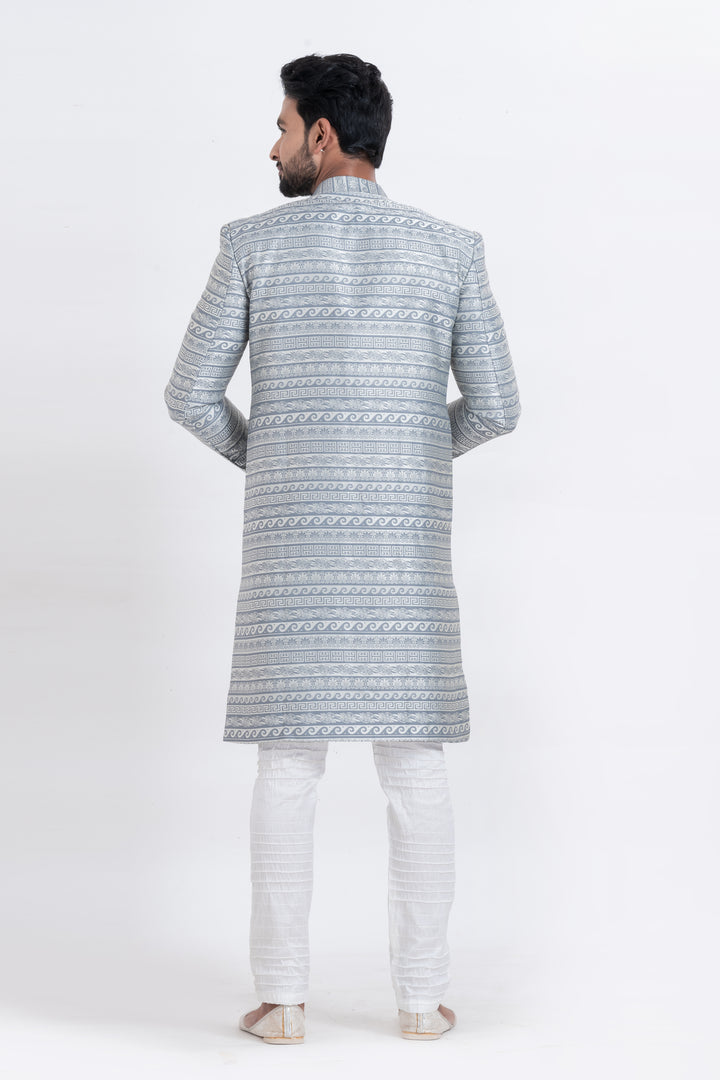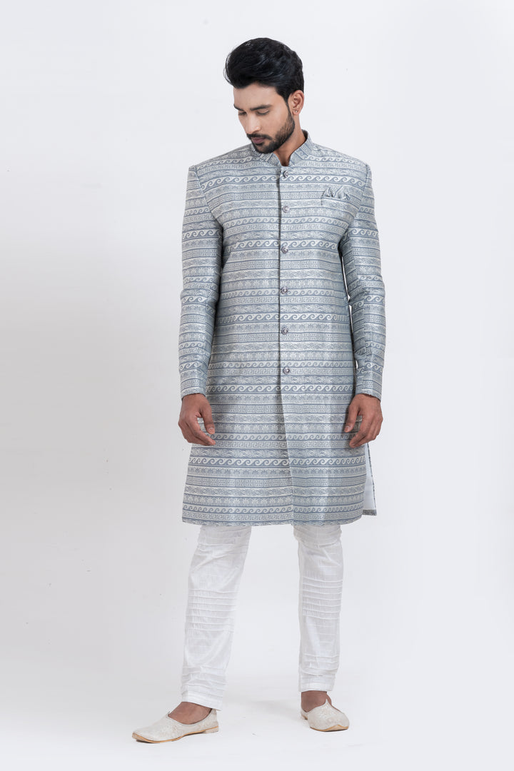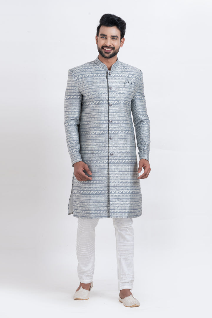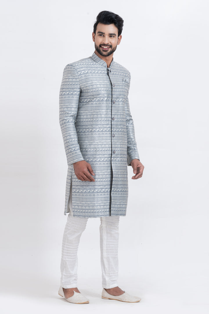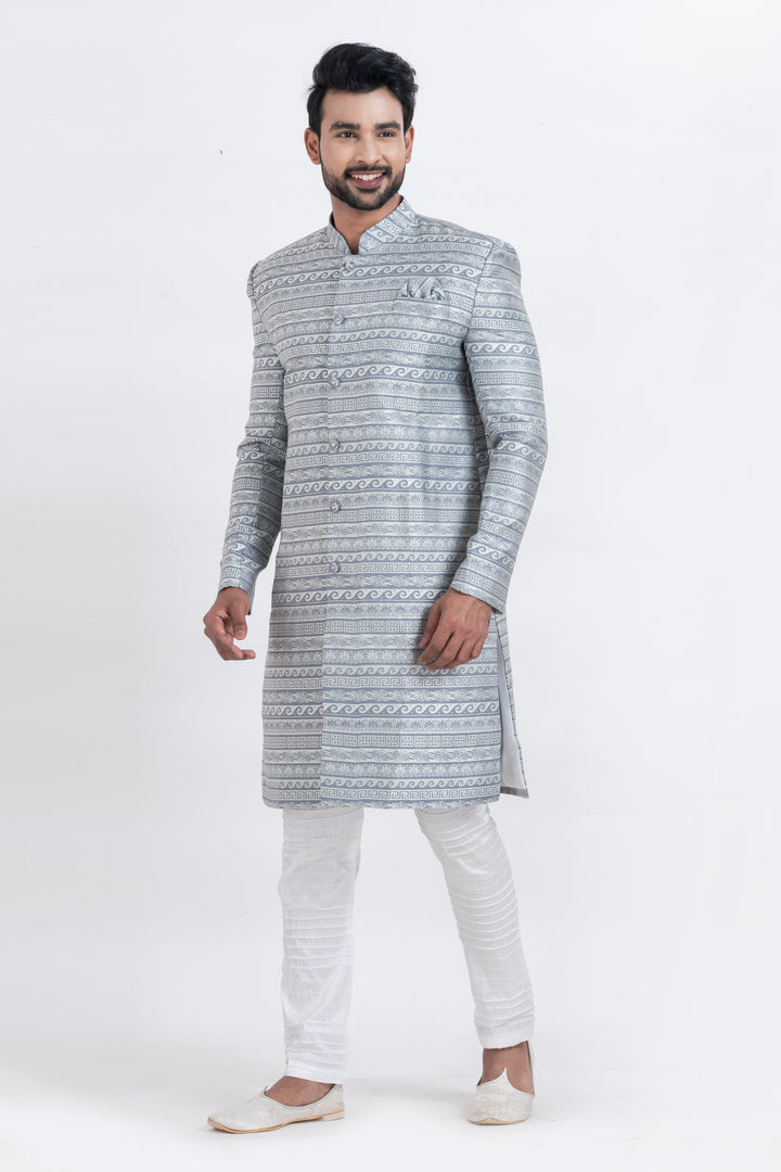 Step into timeless sophistication with our Frosted Elegance Indo Western Set, tailored for the modern man with a royal flair. Designed in an elegant silver-toned brocade fabric, the top showcases meticulously woven ethnic patterns that add a majestic touch to your presence. Paired with a crisp white churidar, this ensemble is a perfect blend of tradition and contemporary charm.