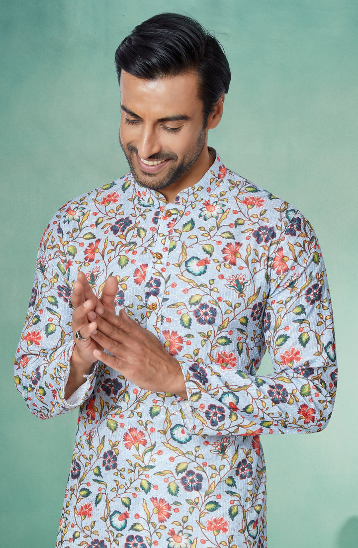 Bring a breath of fresh style to your wardrobe with this White Floral Printed Kurta, blooming with intricate multicolor botanical motifs. The soft, lightweight fabric ensures comfort, while the white Dupion Silk Pyjama adds a polished finish to this artistic ensemble.