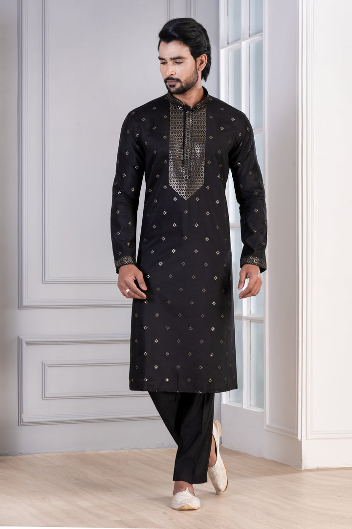 Make a bold statement with this Angasudha Glame Cotton Kurta Pyjama Set, tailored for timeless elegance. The rich Jet Black shade is complemented by delicate sequin motifs scattered all over and a strikingly embellished mirror-work yoke. Crafted from breathable Glame Cotton, this outfit is a stylish choice for evening functions, festive nights, and traditional celebrations.