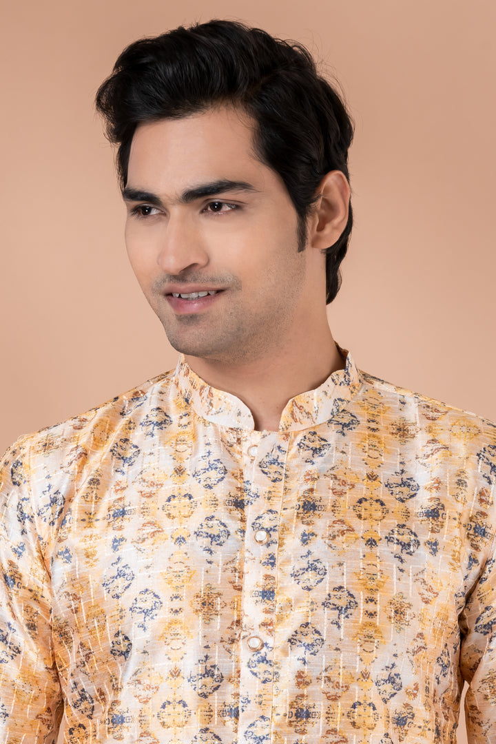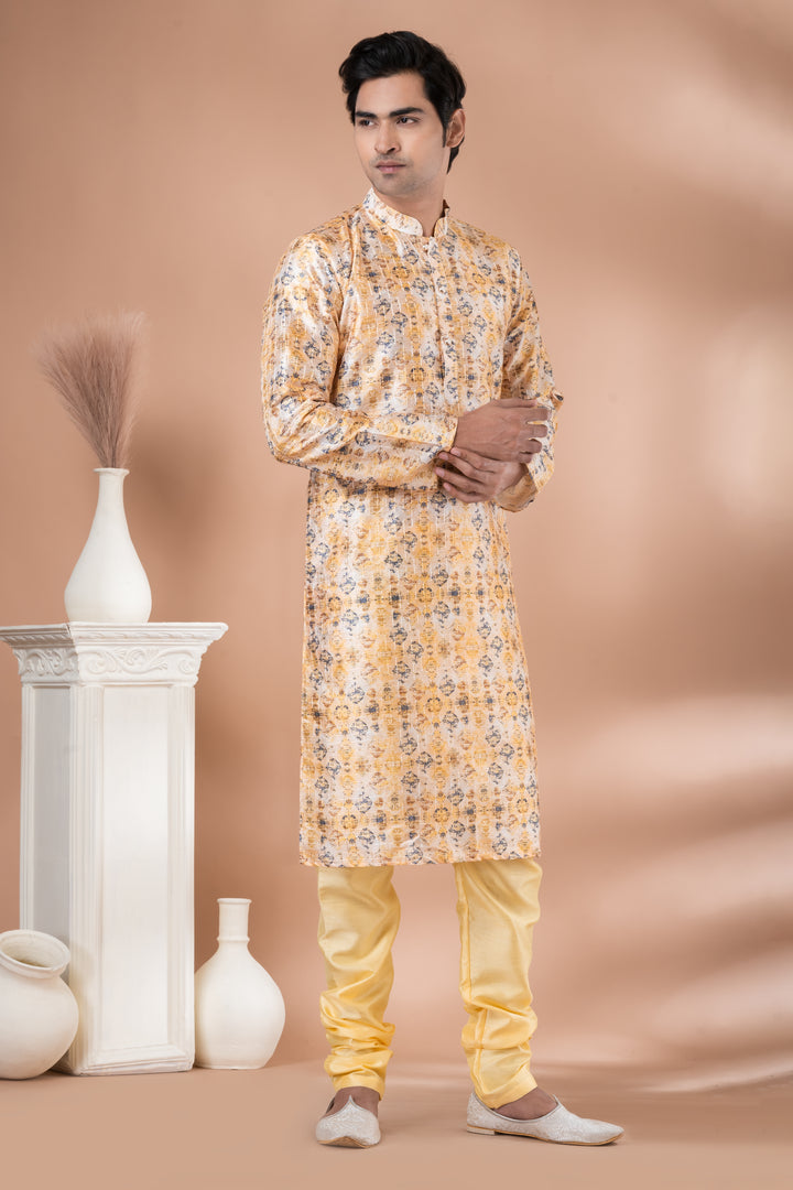 Infuse your festive wardrobe with radiant charm through the Angasudha Golden Aura Kurta Set. Crafted from fine Mono Fabric, this kurta features a sophisticated digital print in soft golden, ivory, and grey tones—perfect for daytime elegance or evening charm. Delicate crochet accents along the placket subtly enhance its luxurious appeal, while the harmonious blend of color and print gives this outfit a modern yet rooted-in-tradition vibe.
