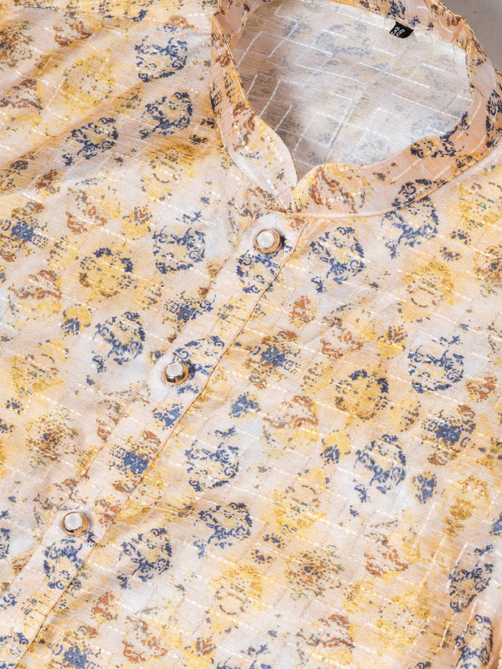 Complemented by a smooth butter-yellow Dupion Silk Pyjama, this ensemble is ideal for haldi functions, religious gatherings, and festive brunches.