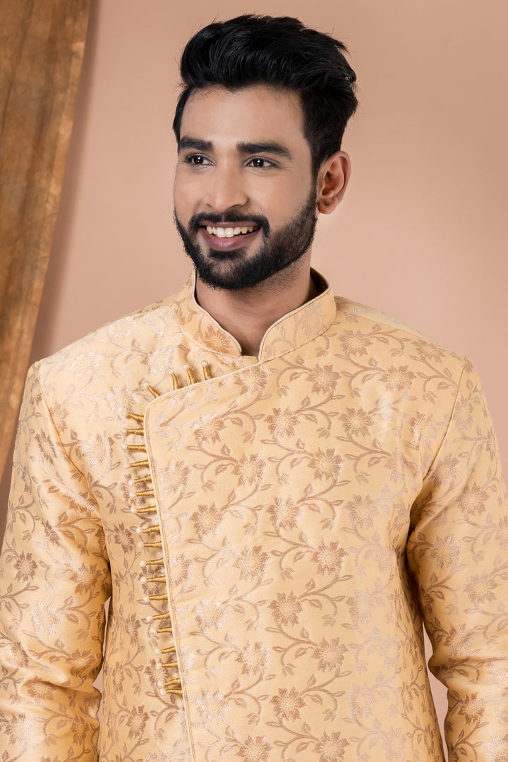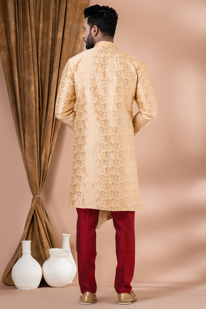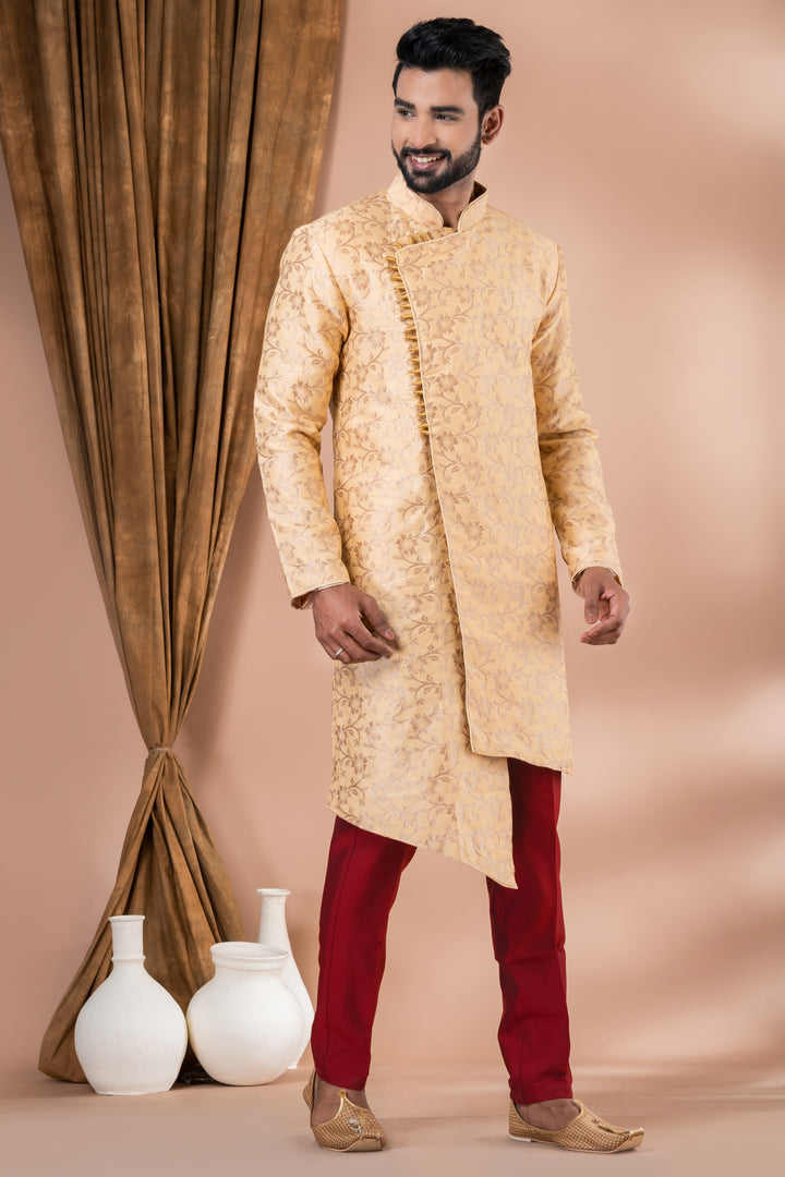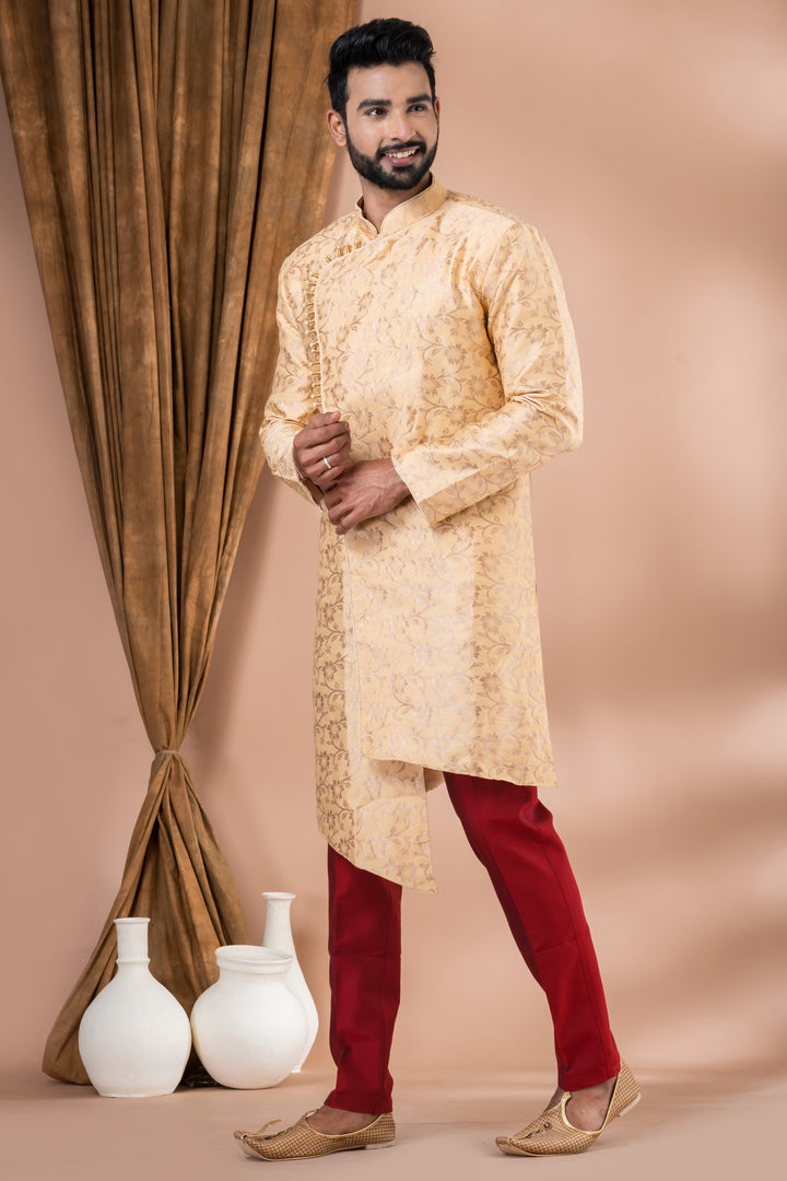Ideal for engagement ceremonies, wedding functions, festive rituals like Diwali or Durga Puja, this ensemble is a top choice for grooms and stylish attendees.