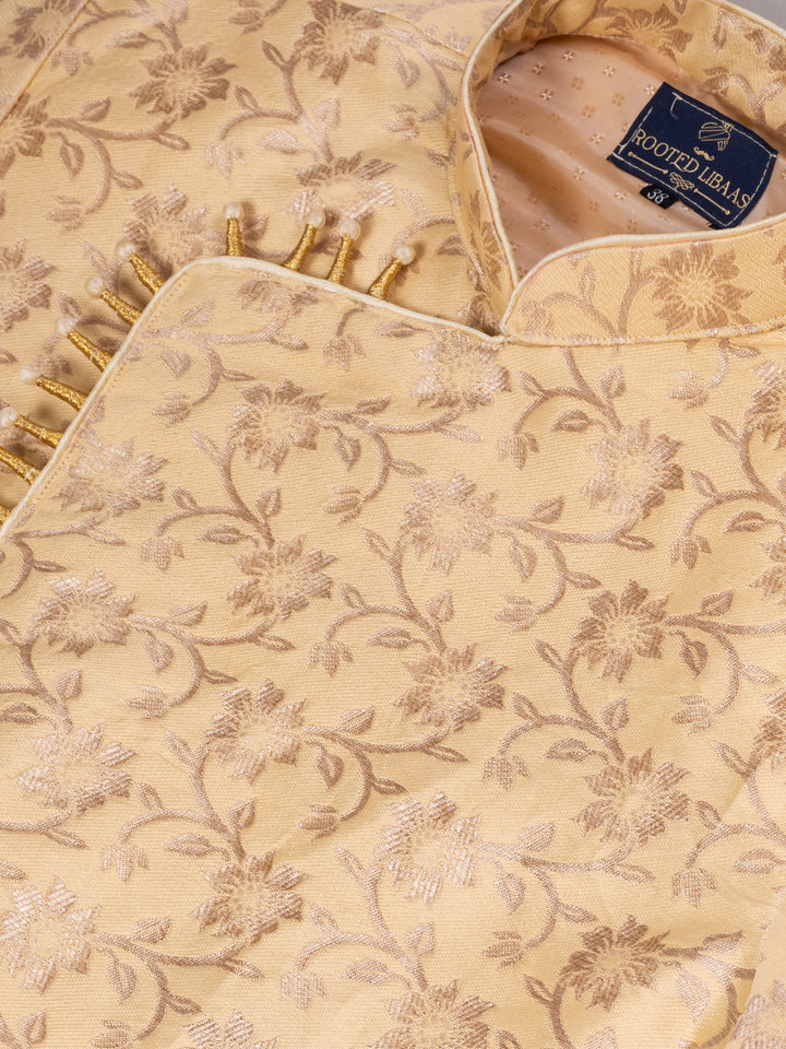 Top Fabric: Soft Golden Beige Banarasi Jacquard featuring intricate floral motifs with a lustrous sheen — perfect for daytime or evening celebrations.