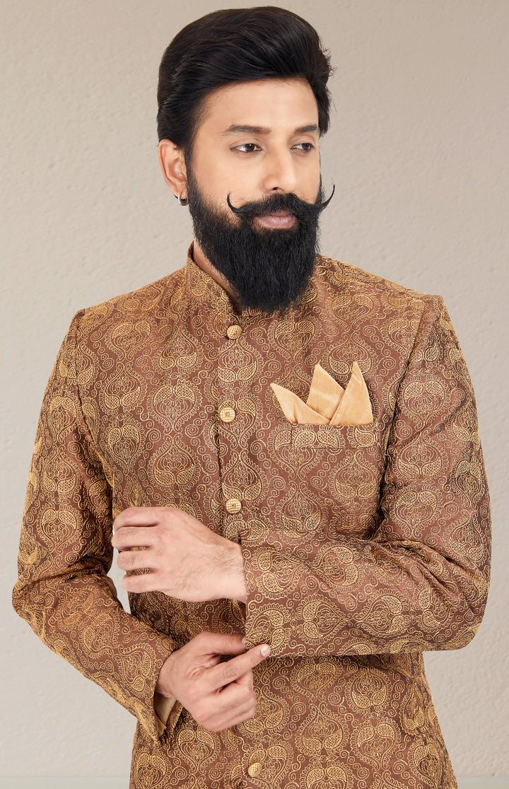 Angasudha Golden Brown Brocade Indo Western Set for Men