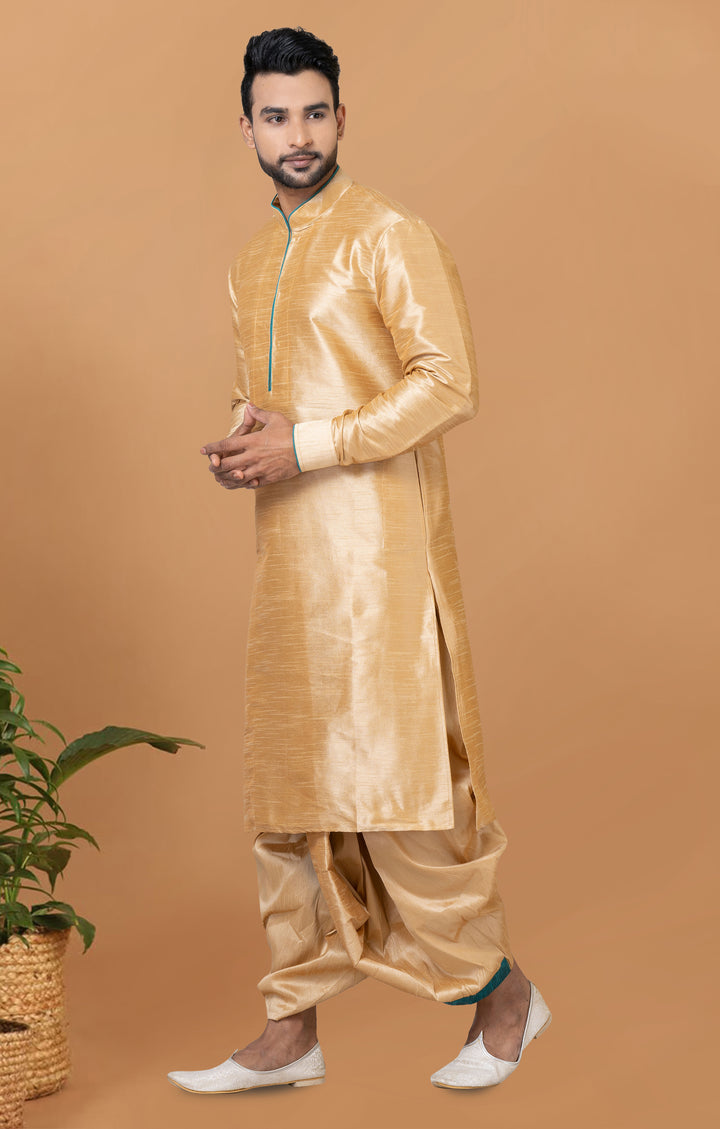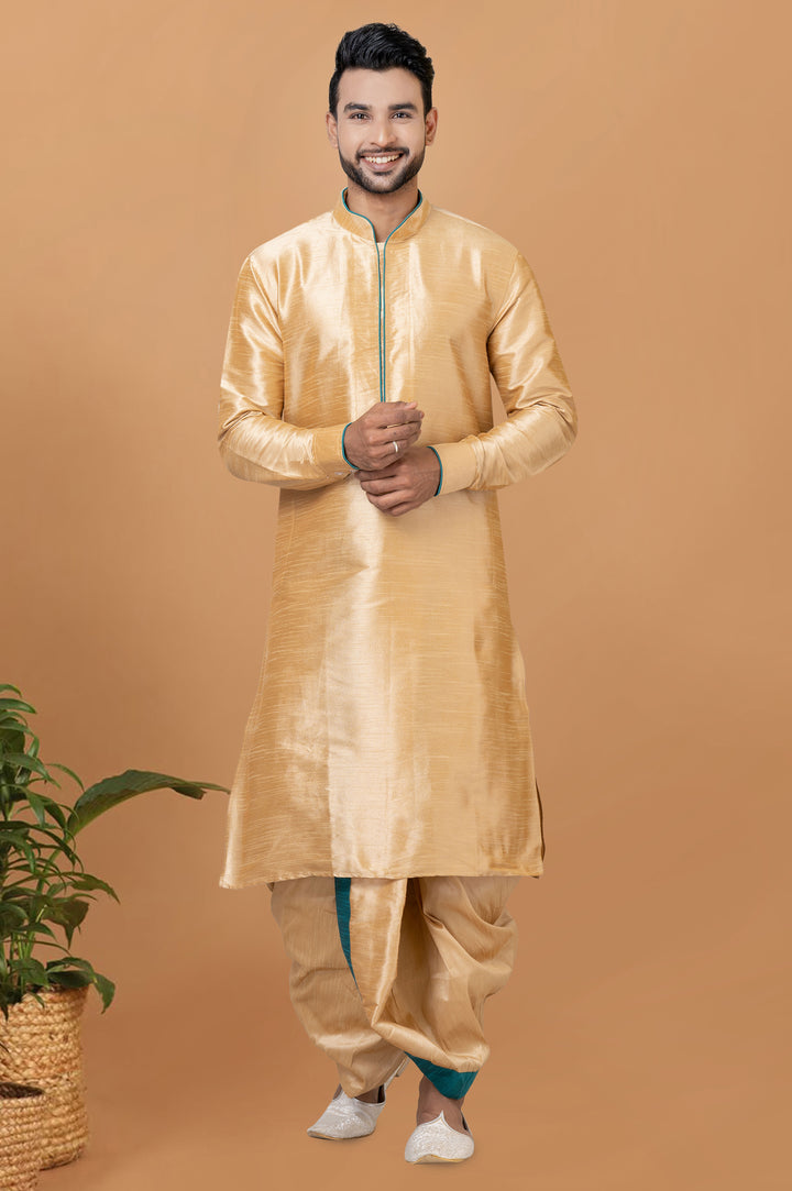 Step into royalty with our Golden Heritage Dhoti Kurta Set, a timeless classic with a modern edge. This radiant ensemble features a gleaming golden kurta crafted from a rich silk blend, tailored with a straight cut and adorned with elegant teal green piping along the collar, placket, and cuffs—offering a refreshing twist to a traditional favorite.