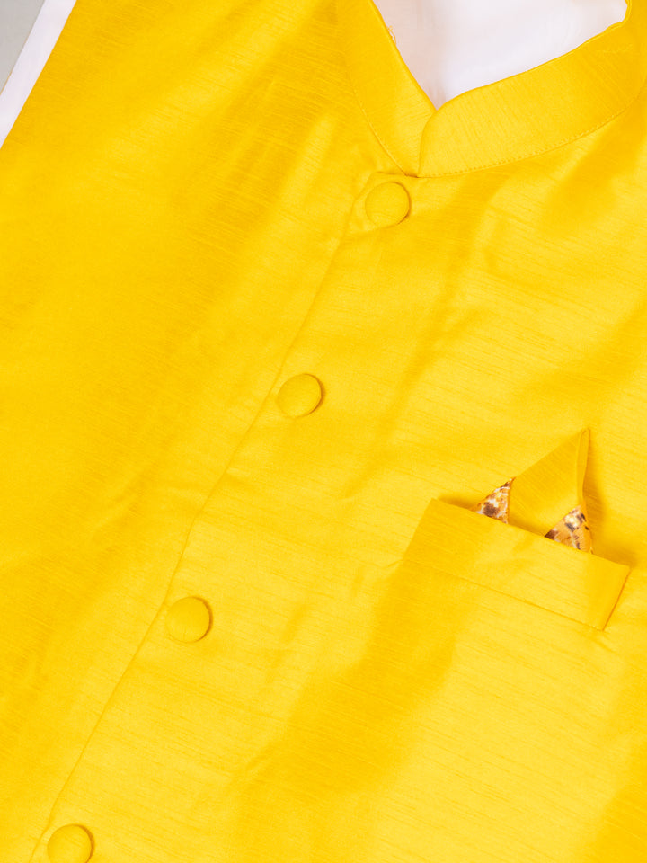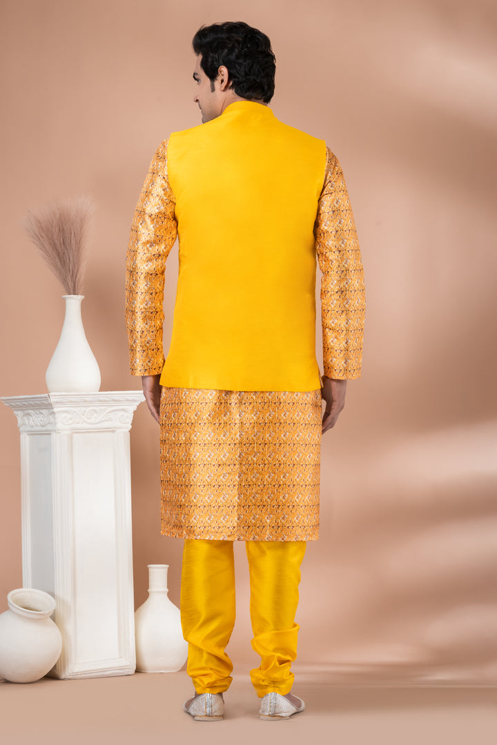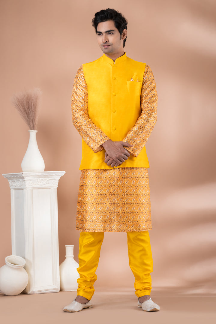 Angasudha Golden Yellow Self-Embroidered Kurta Set with Solid Banarasi Silk Nehru Jacket
