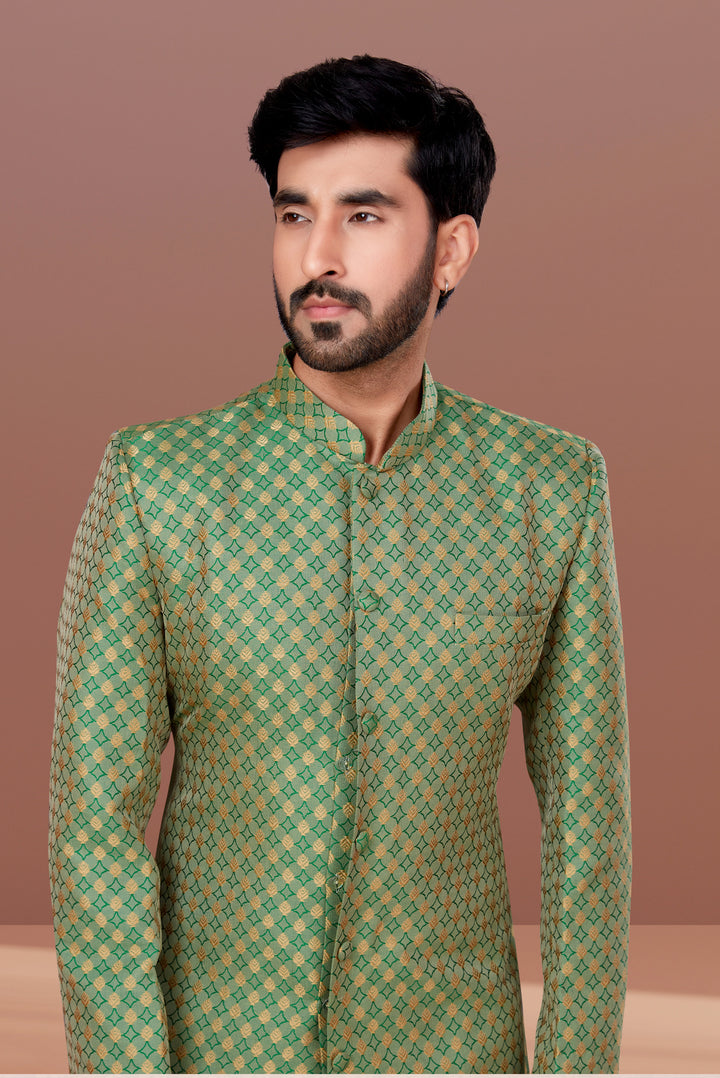Angasudha Green Diamond Weave Brocade Indo-Western with Golden Dhoti