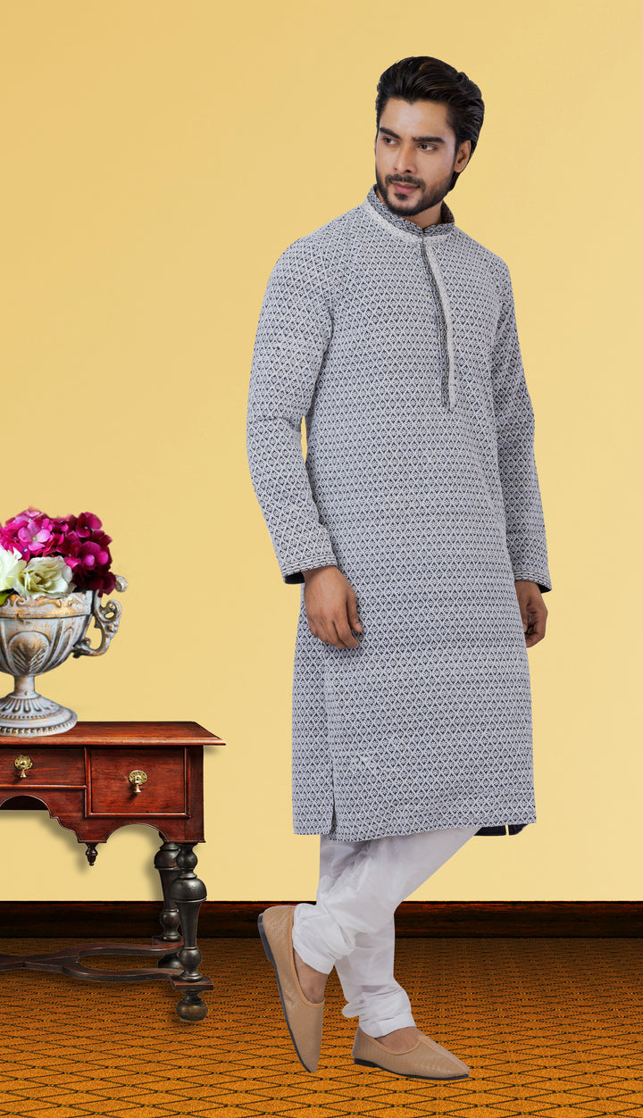 Elevate your ethnic wardrobe with this sophisticated grey kurta from Angasudha, crafted from lightweight georgette fabric featuring intricate all-over self-weaving. Paired with a crisp white dupion silk pyjama, this ensemble blends traditional elegance with modern charm. The band collar and front placket detailing enhance its refined look, making it perfect for festive gatherings, cultural events, or family celebrations.