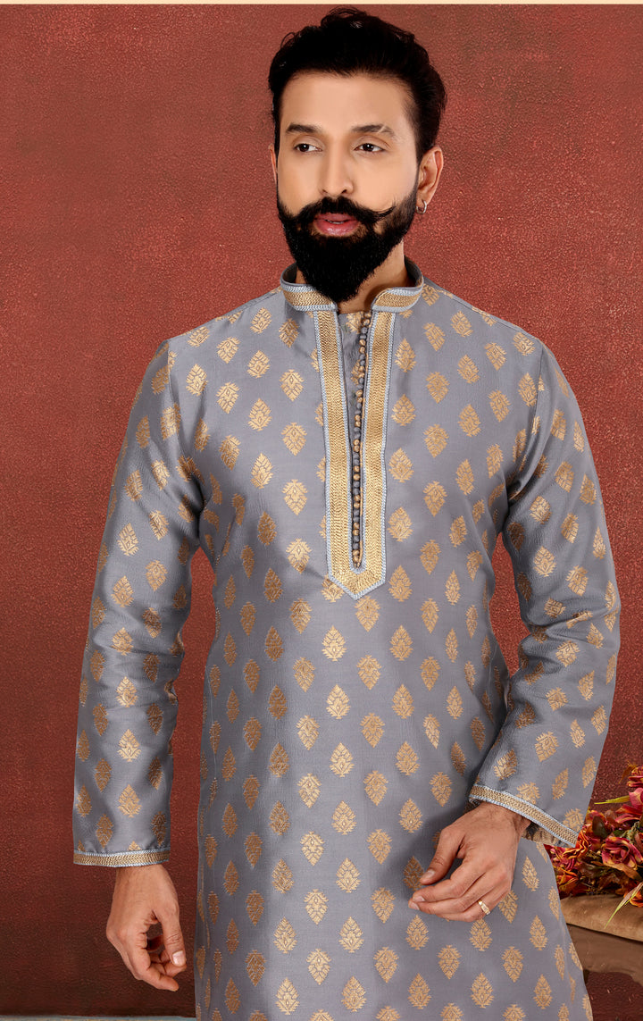 Kurta Fabric: Rich Jacquard Silk with woven golden motifs