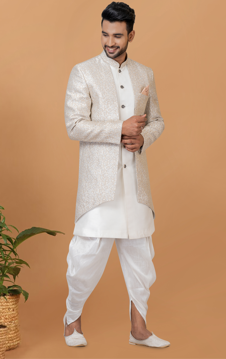 Redefine subtle luxury with this timeless Angasudha Indo-Western ensemble. Featuring a finely textured ivory beige Jacquard Silk jacket, this look is paired with a pristine white Banarasi Dhupion kurta and a classically draped white dhoti, making it ideal for traditional occasions with a sophisticated edge.