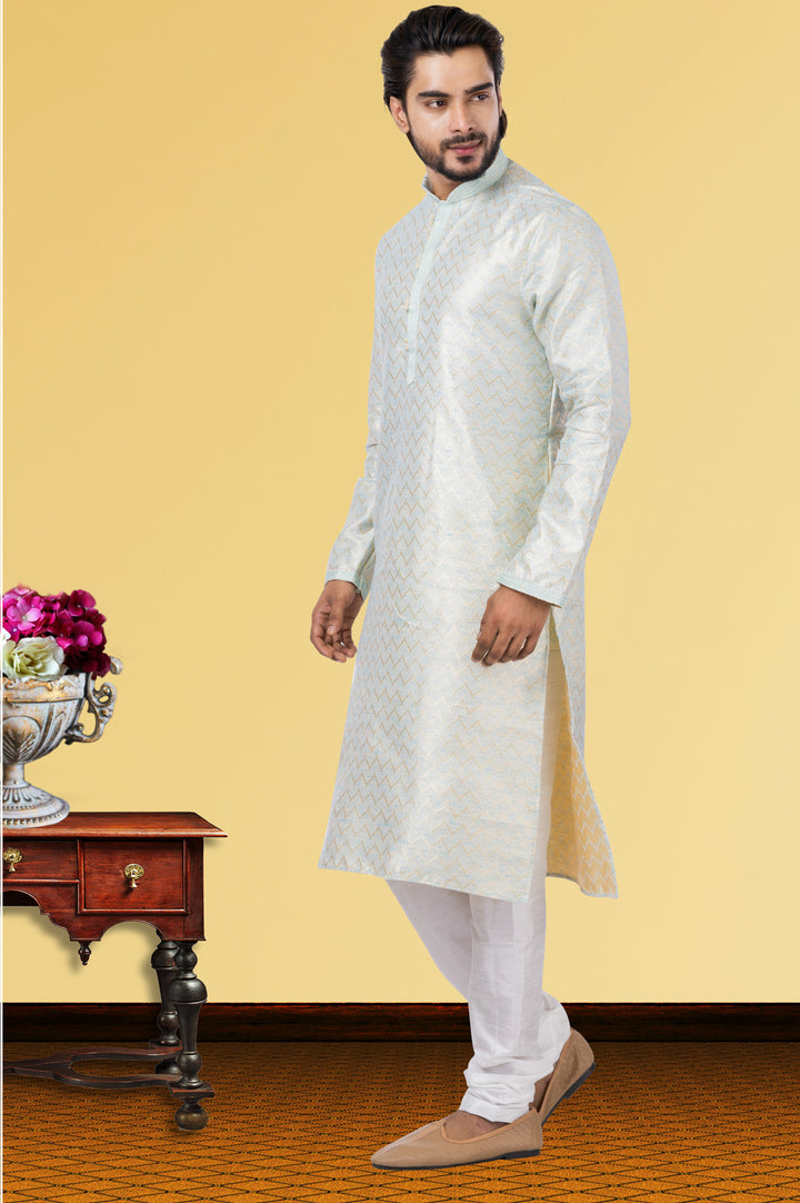 Step into subtle sophistication with this elegantly woven Linen Silk kurta paired with a crisp Dupion Silk pyjama. The kurta’s soft ivory hue is elevated by a delicate self-patterned weave, offering a perfect blend of tradition and grace. Designed with a mandarin collar and front button placket, this outfit is ideal for both festive celebrations and classy daytime events.