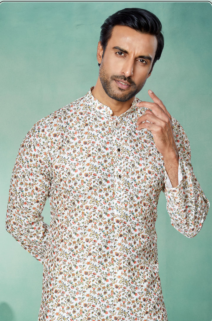 Welcome timeless elegance with this Ivory Kurta adorned in delicate all-over floral prints in earthy greens, soft reds, and subtle browns. Crafted from breathable mono fabric and paired with a classic white Dupion Silk Pyjama, this outfit is the perfect pick for daytime occasions that call for refined ethnic style.