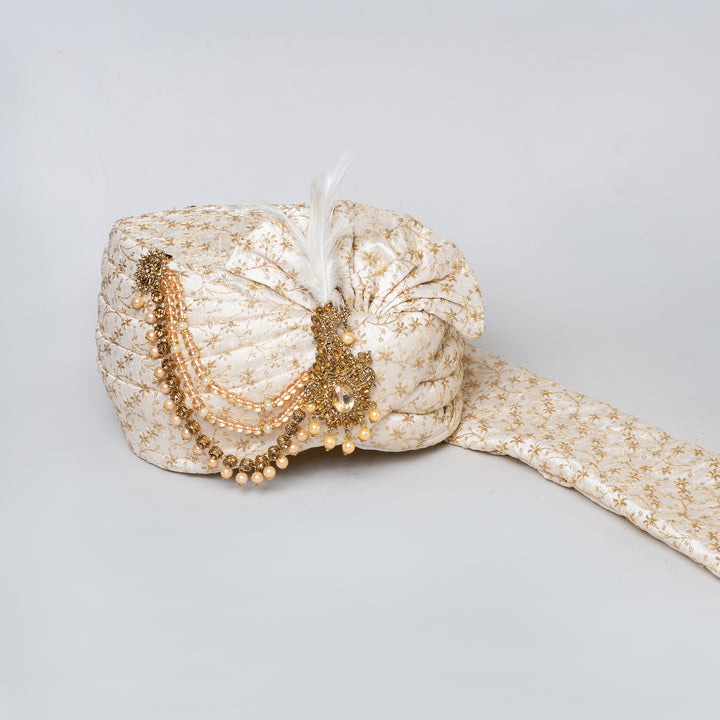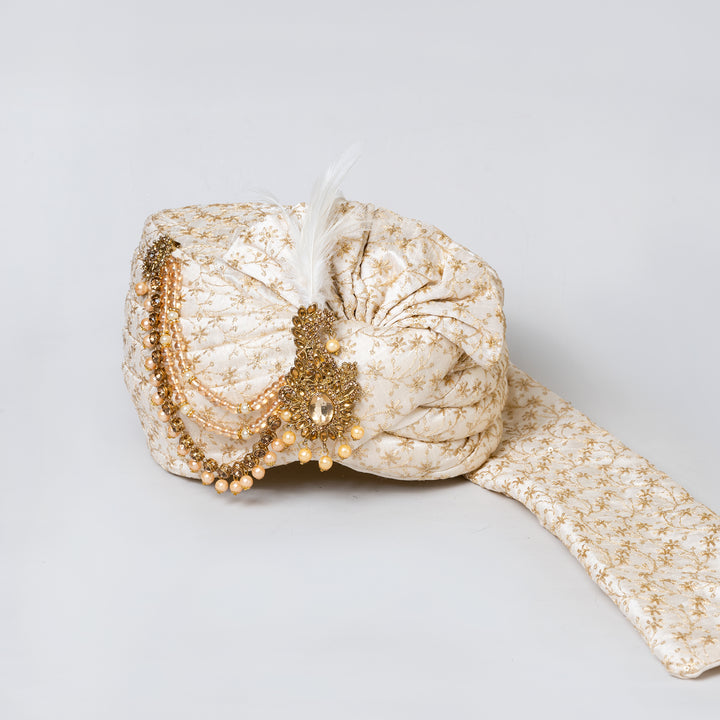 Angasudha Ivory Gold Embroidered Groom Pagdi with Feather & Stole Set