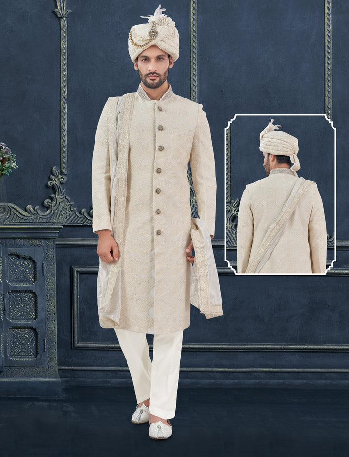 Step into regal sophistication with this Ivory Gold Textured Sherwani Set, an exceptional pick for weddings, bridal receptions, or traditional engagement ceremonies. This sherwani features an elegant jacquard-inspired self-design highlighted by golden threadwork, offering a royal yet timeless look perfect for the groom.