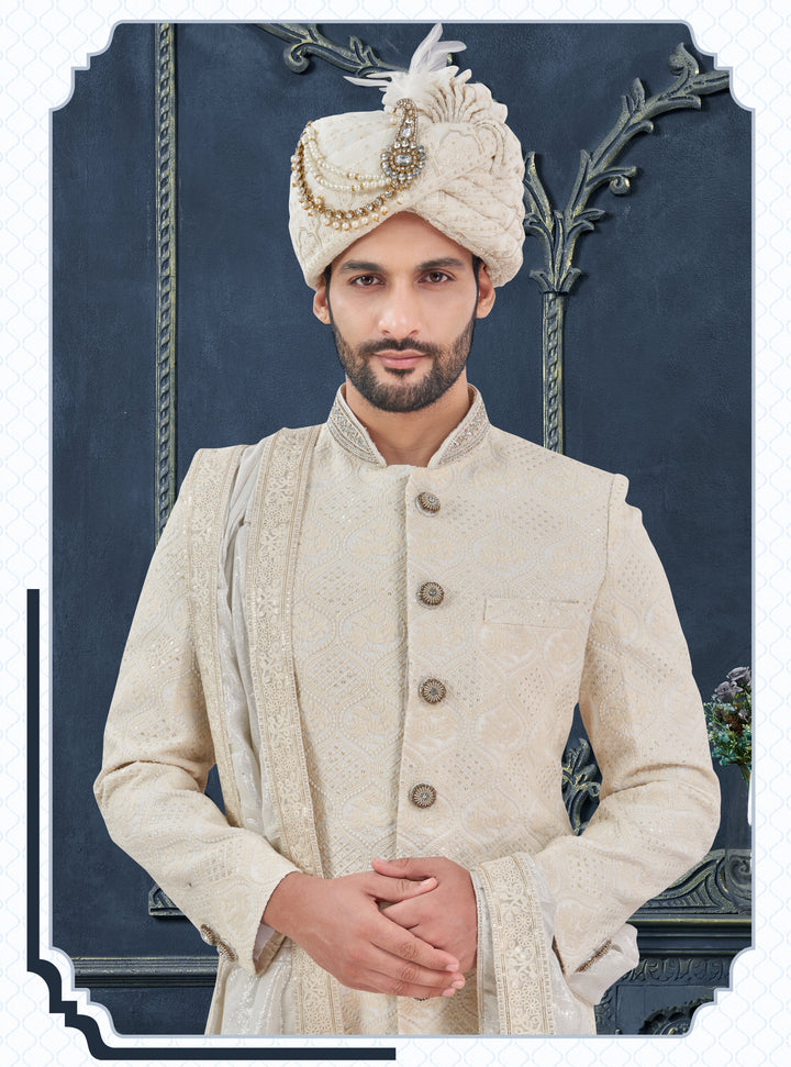The classic ivory palette is beautifully complemented by an embroidered dupatta and a heavily adorned matching turban with pearl chains and feather detailing. Finished with cream churidar bottoms, this ensemble brings together poise, luxury, and traditional finesse for your big day.