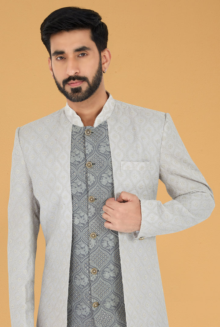 Drape yourself in royal finesse with this Angasudha Indo-Western Set, showcasing a graceful blend of tradition and modern sophistication. The ivory jacquard jacket is adorned with a delicate woven pattern, paired harmoniously with a richly woven grey kurta featuring intricate ethnic motifs. Completed with a sleek silver art silk churidar, this ensemble is perfect for festive moments and regal celebrations.