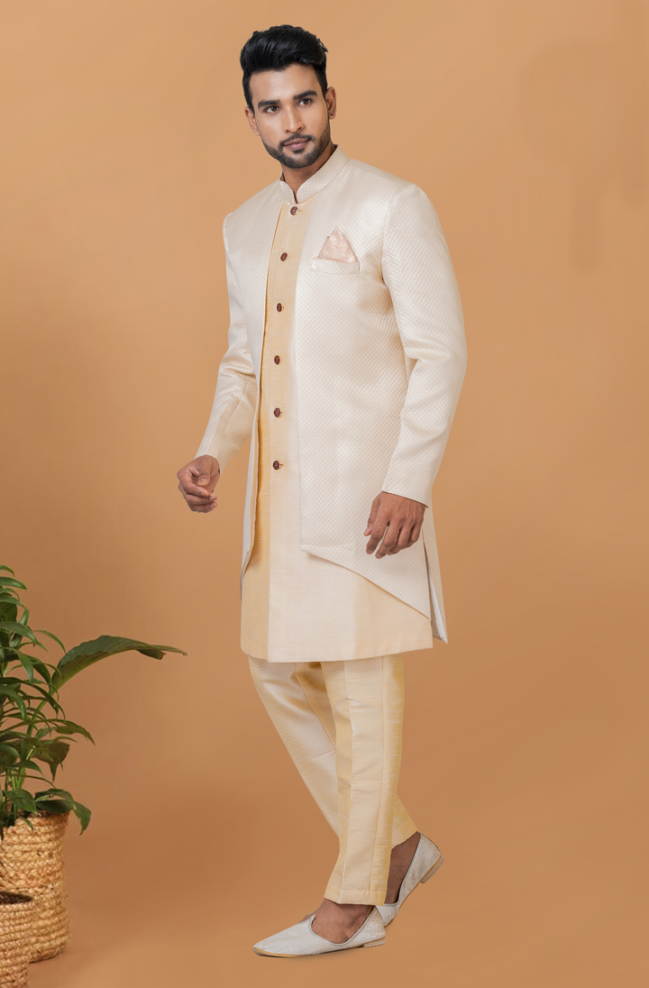 Step into timeless elegance with this stunning Indo Western set by Angasudha. Featuring a finely woven Jacquard Silk asymmetric jacket, this ensemble is layered over a smooth Banarasi Dhupion silk kurta and straight-cut bottoms. The soft ivory tone, refined button detailing, and structured silhouette make it a perfect pick for any royal celebration.