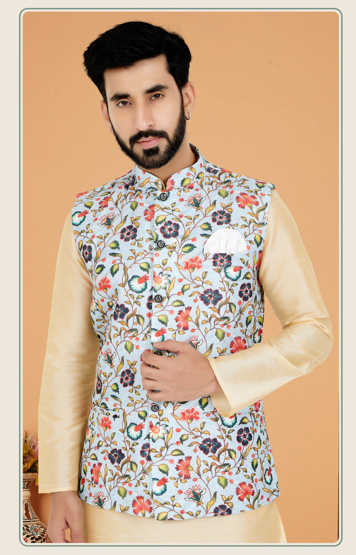 Celebrate vibrant tradition with the Angasudha Ivory Floral Printed Waistcoat Set, a perfect blend of rich culture and modern charm. The Nehru jacket features a detailed multicolor floral print that pops beautifully against an ivory base, adding freshness and flair to your ethnic look.